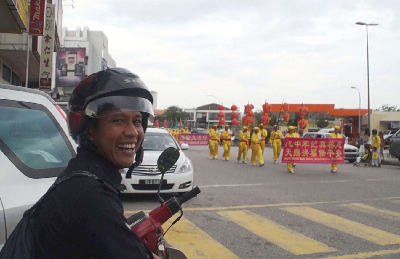 特别把摩托车停在路旁观看游行的马来民众Zaiman开心地表示:“今天感到很惊喜和热闹。”他透露,因为这是第一次在班丹英达这里看到法轮功的游行。之前,他曾在吉隆坡独立广场、吉隆坡双峰塔(KLCC)等地方看过由法轮功学员组成的天国乐团的演奏。因此,他为法轮功学员到此地举办游行感到十分惊喜。