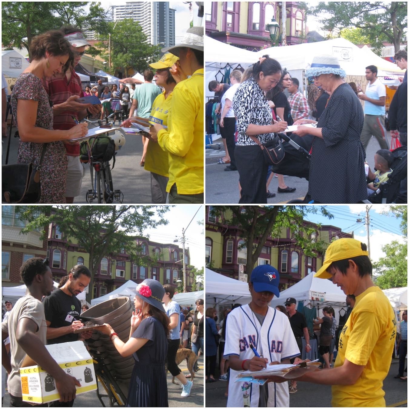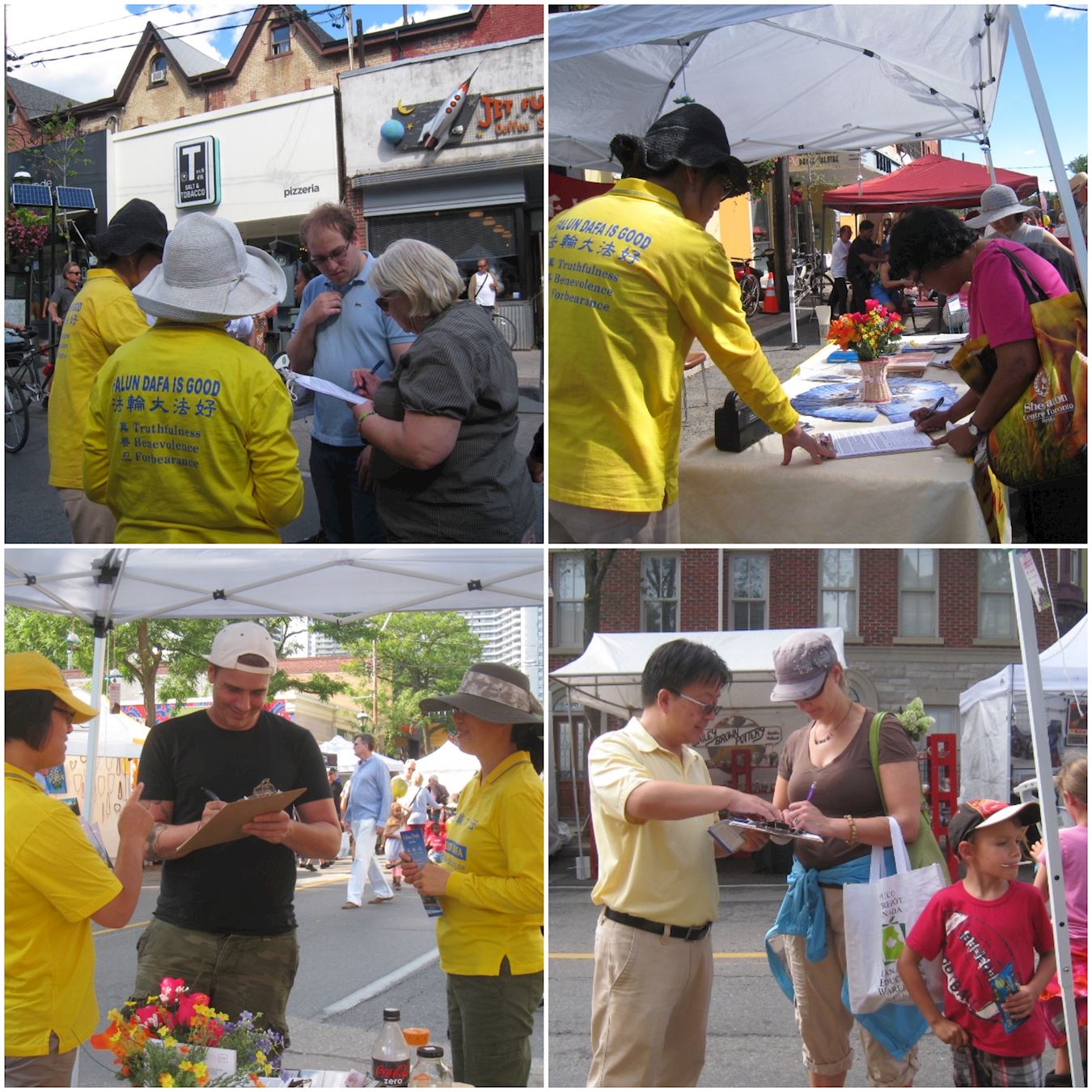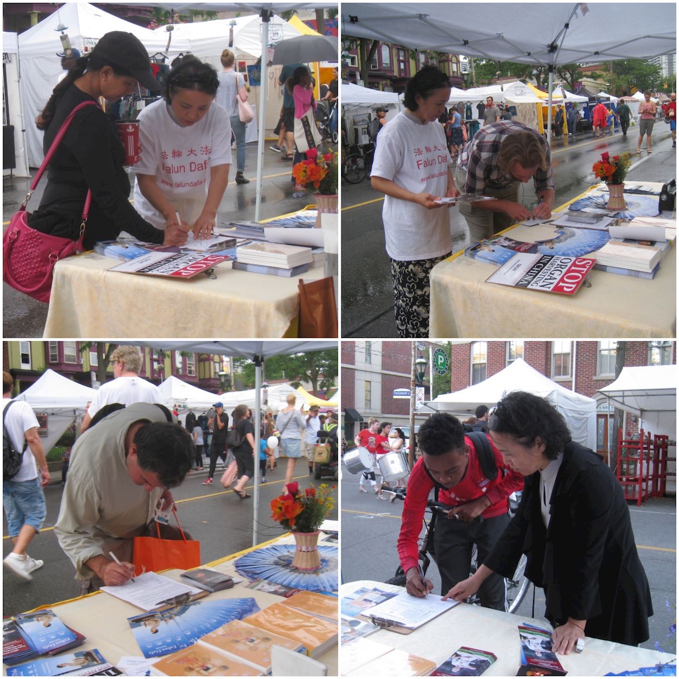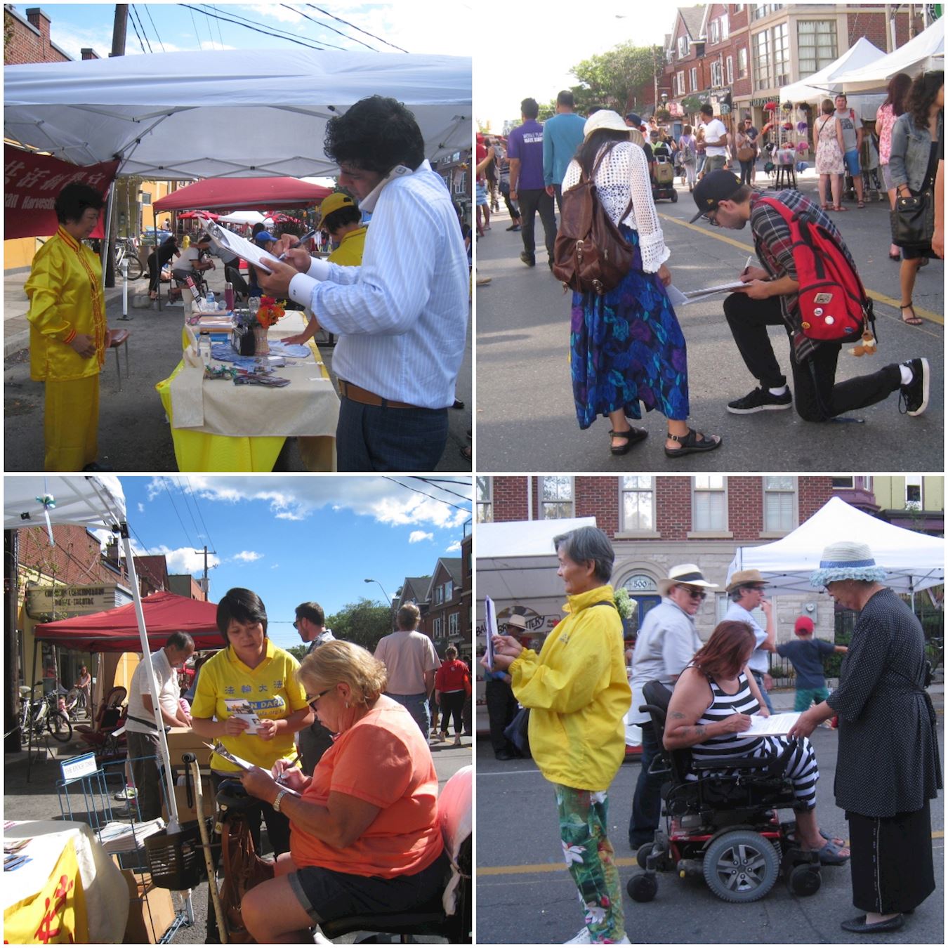 法轮大法展位上有“法轮大法好”和“制止中共活摘器官”横幅,身穿黄色书有“法轮大法”字样衣服炼功的法轮功学员及精美的法轮大法书籍和写有“法轮大法好”的小莲花吸引了很多游客,人们纷纷来到展位或在展位附近签名送给总理贾斯汀·特鲁多的明信片和邮给加拿大国会的请愿表,呼吁总理和加拿大政府在中国总理李克强来加访问时提出立即停止迫害法轮功、以及制止活摘法轮功学员器官等侵犯人权的罪行。