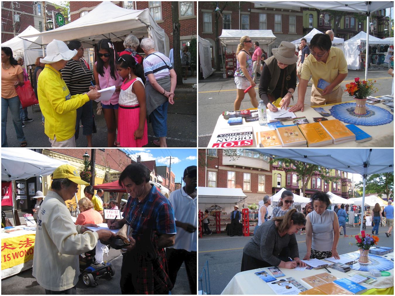 图1:法轮功的展位总是有很多游客驻足和学员们交谈,了解真相 |