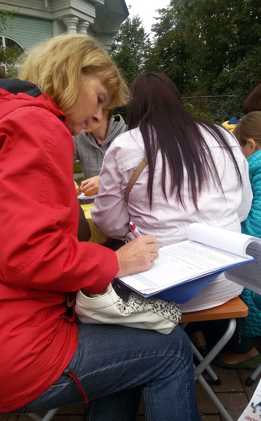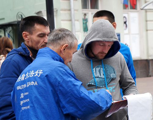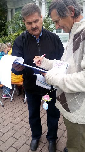 一位年岁很大的俄罗斯老奶奶看了学员的功法展示,并听说了学员对她讲述的法轮功在中国遭受的迫害和活摘法轮功学员器官的事实后,赶紧留下了自己的签名呼吁制止迫害。