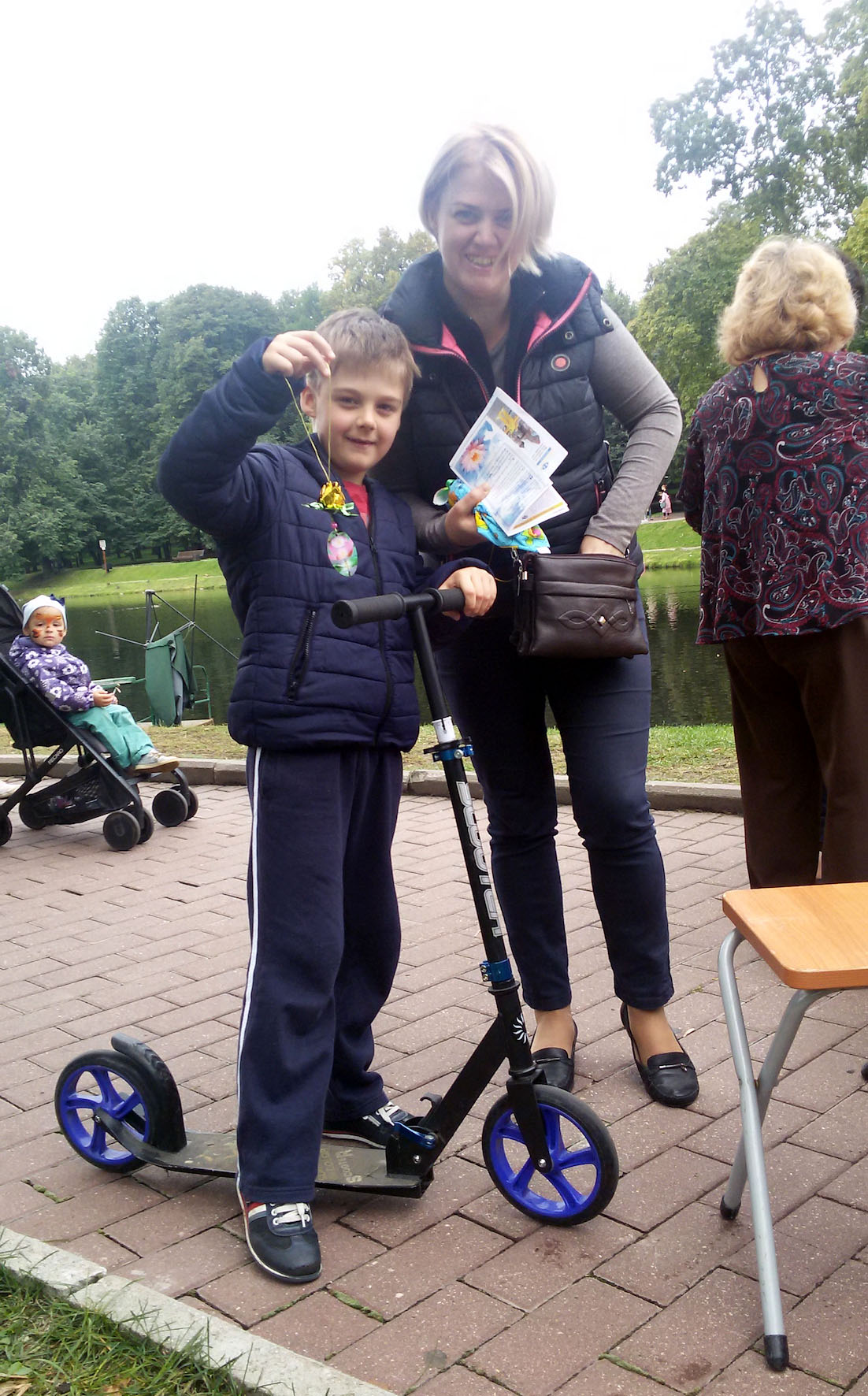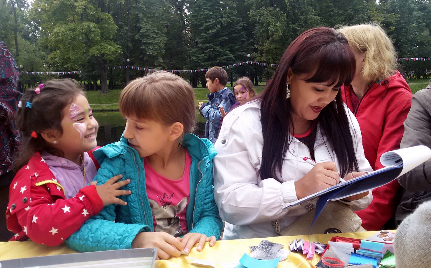 在叶卡捷琳娜公园的人工湖旁边设有多张桌椅板凳,莫斯科法轮功学员在教小朋友和家长们叠做纸莲花的过程中,向人们讲述着法轮大法的美好和发生在中国对法轮功学员的残酷迫害。