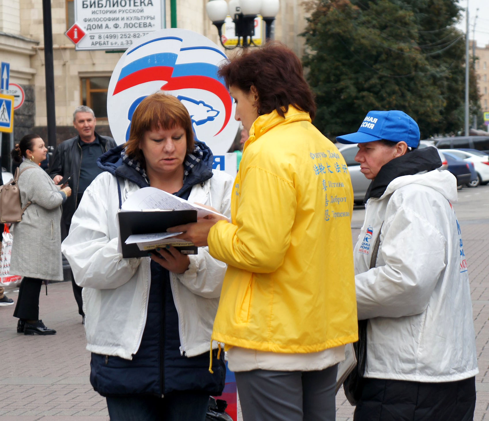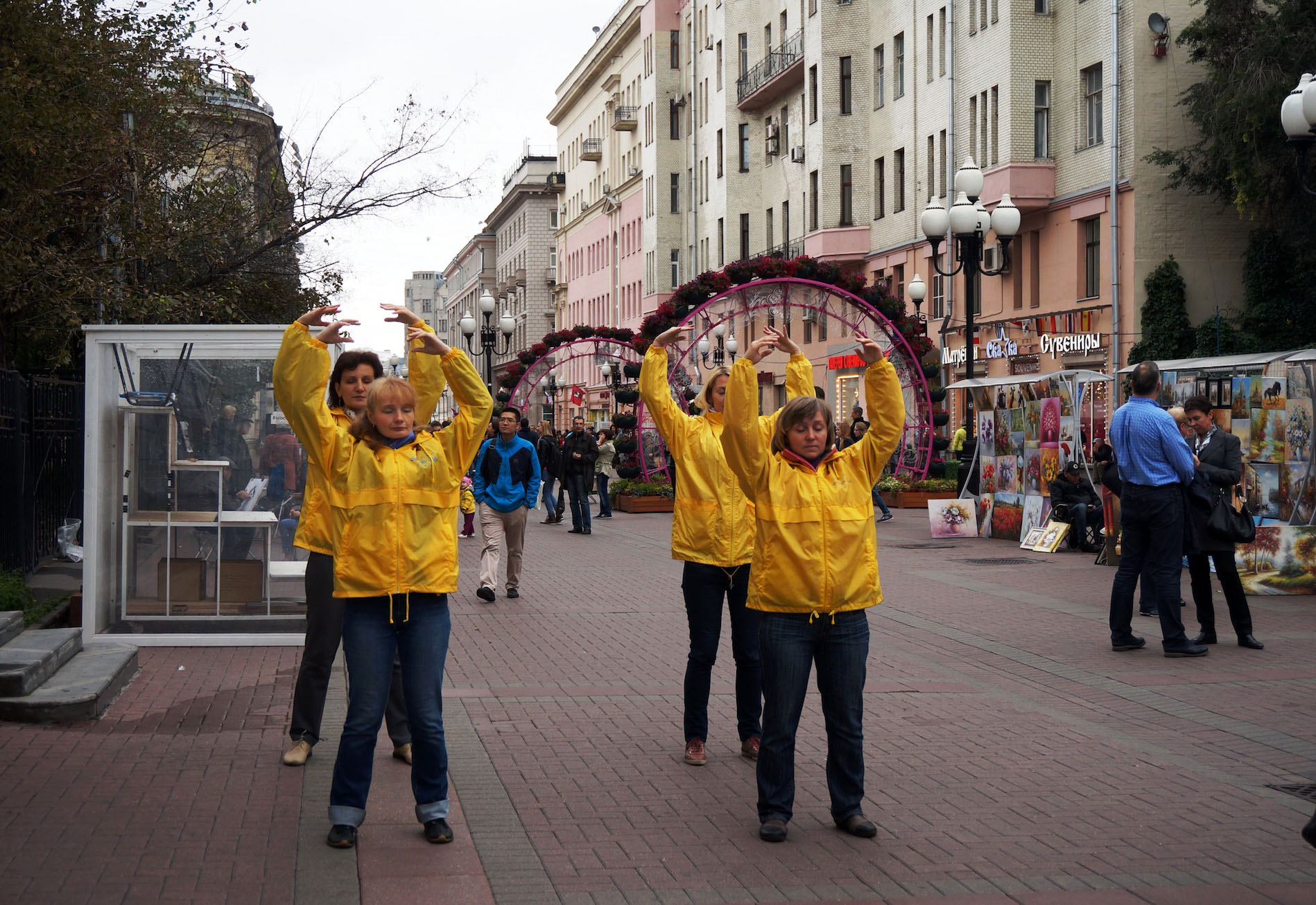 在九月十日、十一日两天,同时在莫斯科市中心著名的阿尔巴特步行街上,莫斯科法轮功学员举办了功法展示和讲真相征签活动。