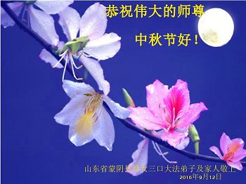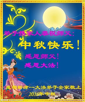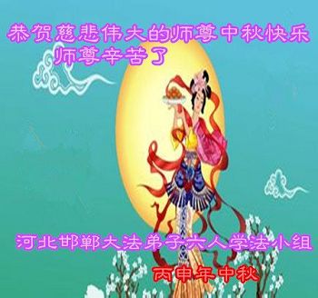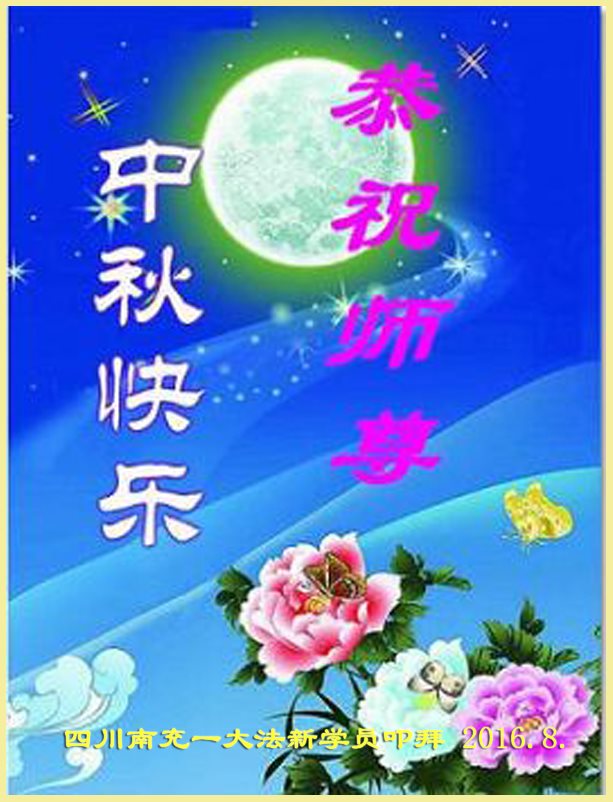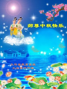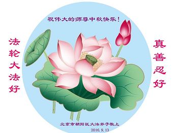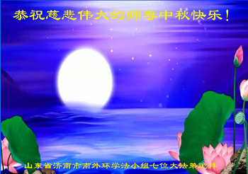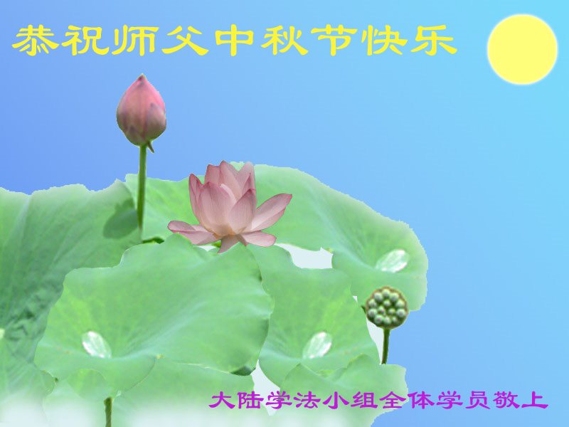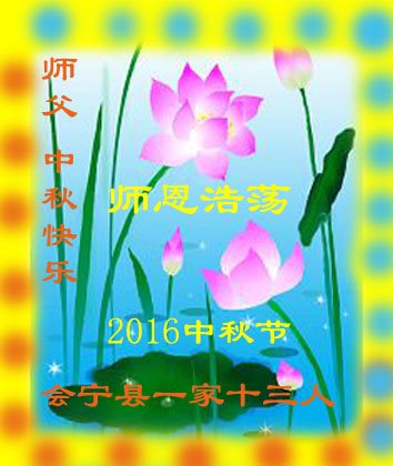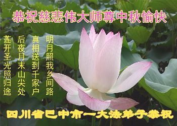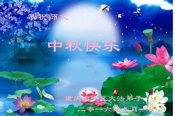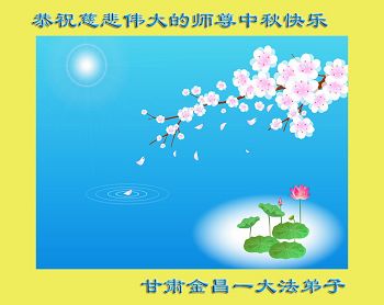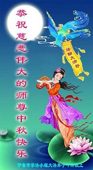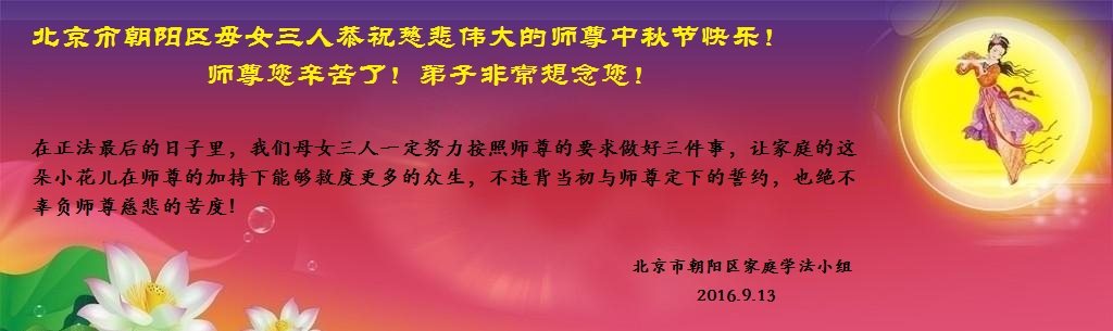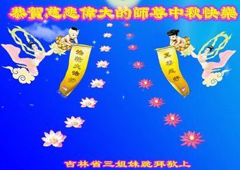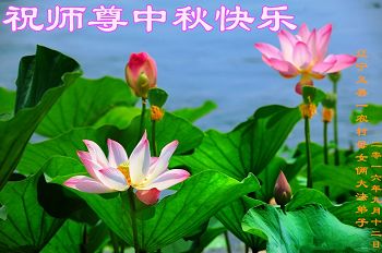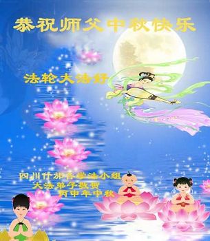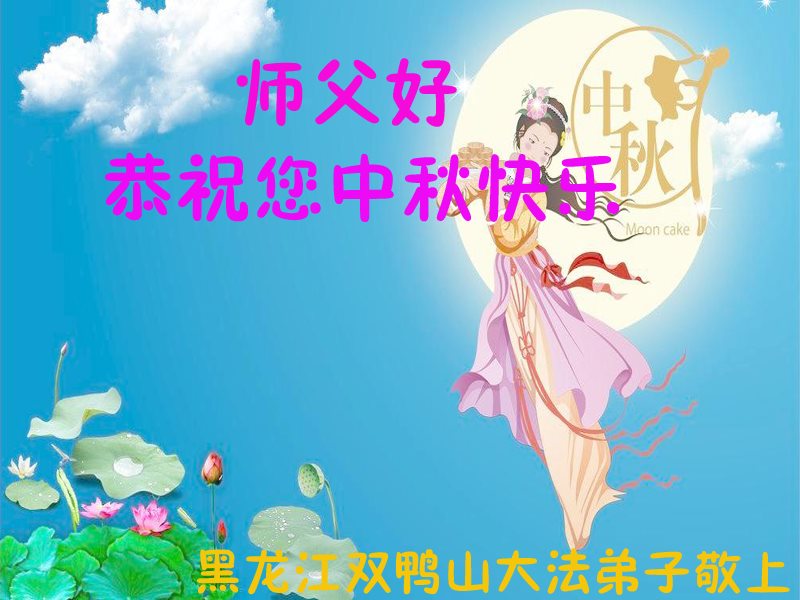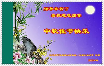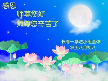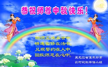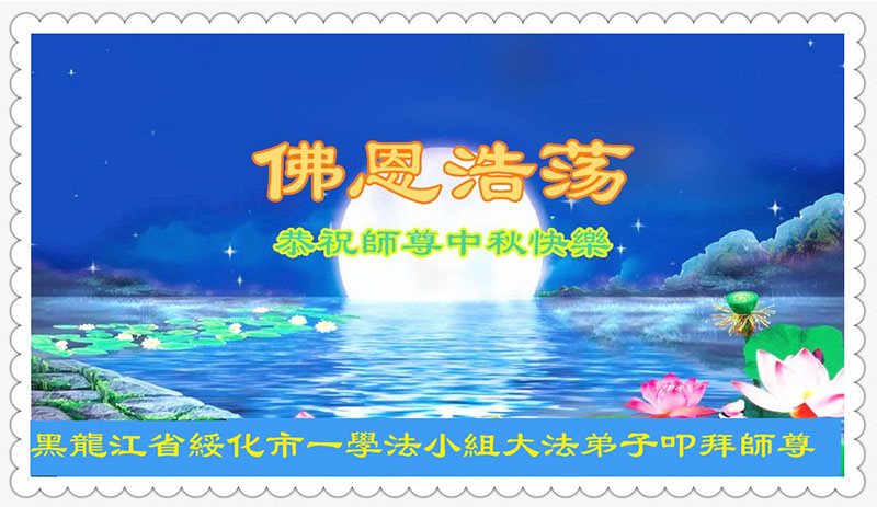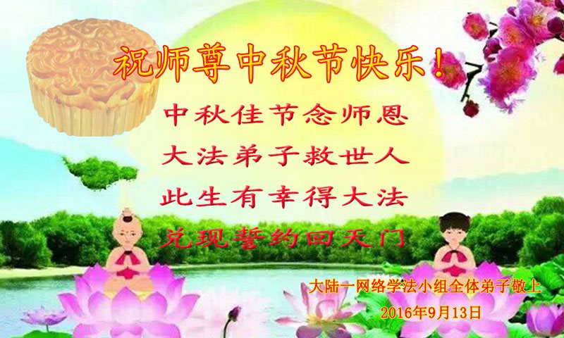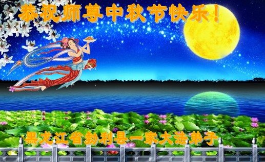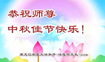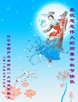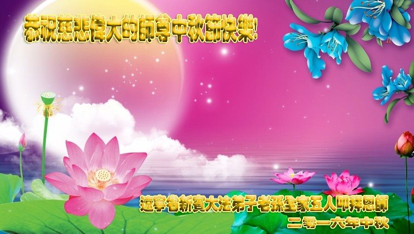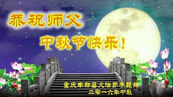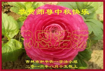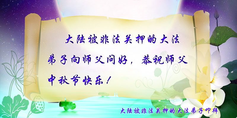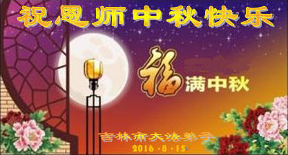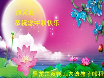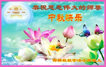 中秋节快到了,我和我得法三年,过去一字不识现在能看大法书学法,八十四的老母亲及明真相的妹妹恭祝师尊中秋节快乐!叩谢师恩,感恩师尊您的慈悲苦度。我们深知:没有恩师的救度,没有大法的传出,就没有我们的今天。