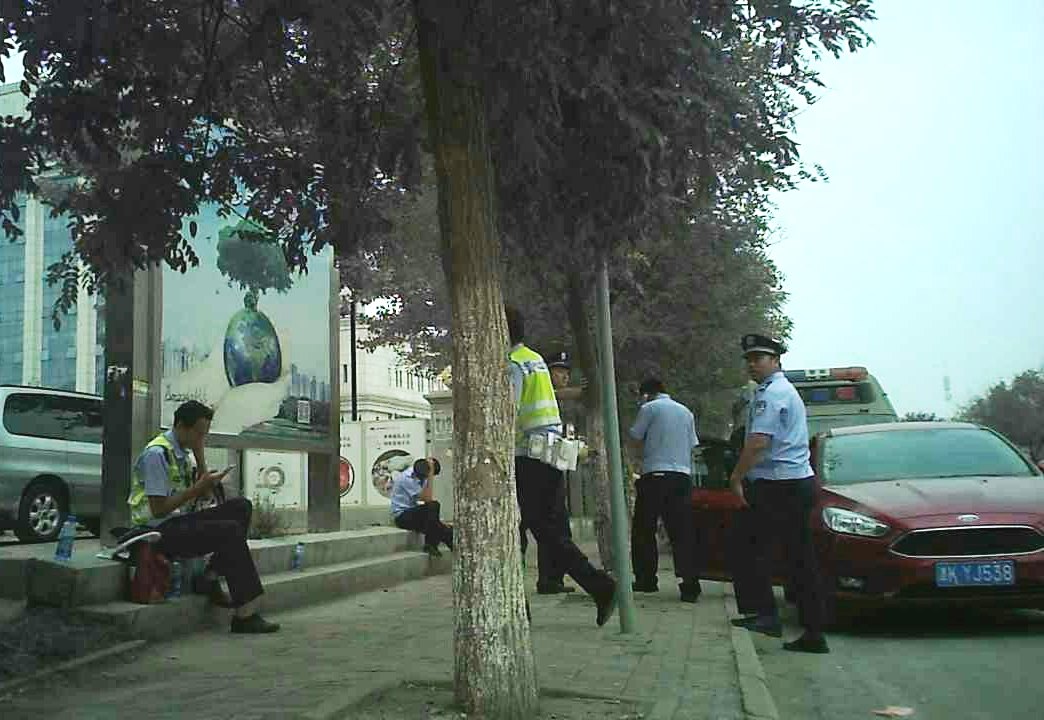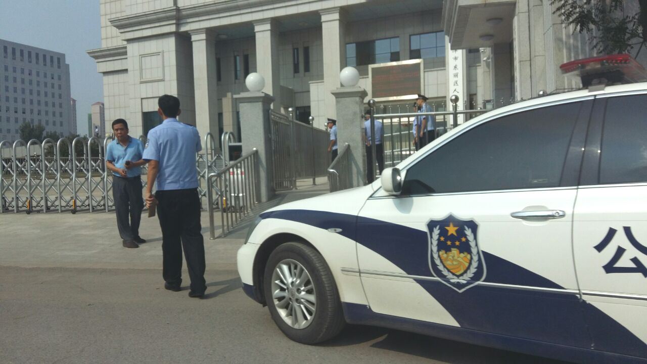 一大早天津市东丽区法院警戒森严,天津当局动用了百十号的警员和便衣,三步一岗五步一哨,还有警察来回巡逻,法院外面至少停着十辆警车和特警的车辆,一辆地方牌照的车上放着两个对讲机,一个女人的声音在布置:冻一、冻二、冻三、冻四向法院东侧大道集结。