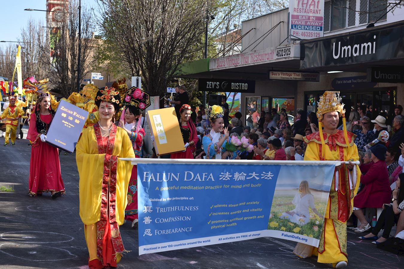 澳洲天国乐团自二零零七年起,每年都参加这个南半球历史最悠久的花卉嘉年华大游行,并深受广大民众的欢迎和赞赏。一首首雄壮有力、慈悲祥和的乐曲,感染着沿途十万民众。人们为天国乐团鼓掌、喝彩,不时有人高喊:“你们太棒了!”“了不起!”“法轮大法好!”“我爱你们!谢谢!”相机、手机纷纷举起,拍摄下美好珍贵的镜头。观众中的很多华人更是满面笑容,不时竖起大拇指表示赞赏和自豪。