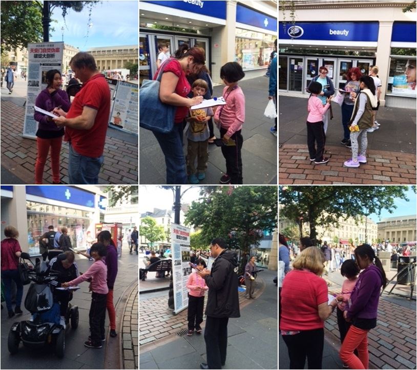 【明慧网二零一六年九月十九日】2016年9月17日星期六,法轮功学员在英国苏格兰邓迪市(Dundee)最大的购物中心前举办反迫害征签活动,介绍以“真善忍”为修炼原则的法轮功,揭露中共十七年来对法轮功的残酷迫害,尤其是活摘法轮功学员器官的罪行,并呼吁人们共同制止这种暴行。