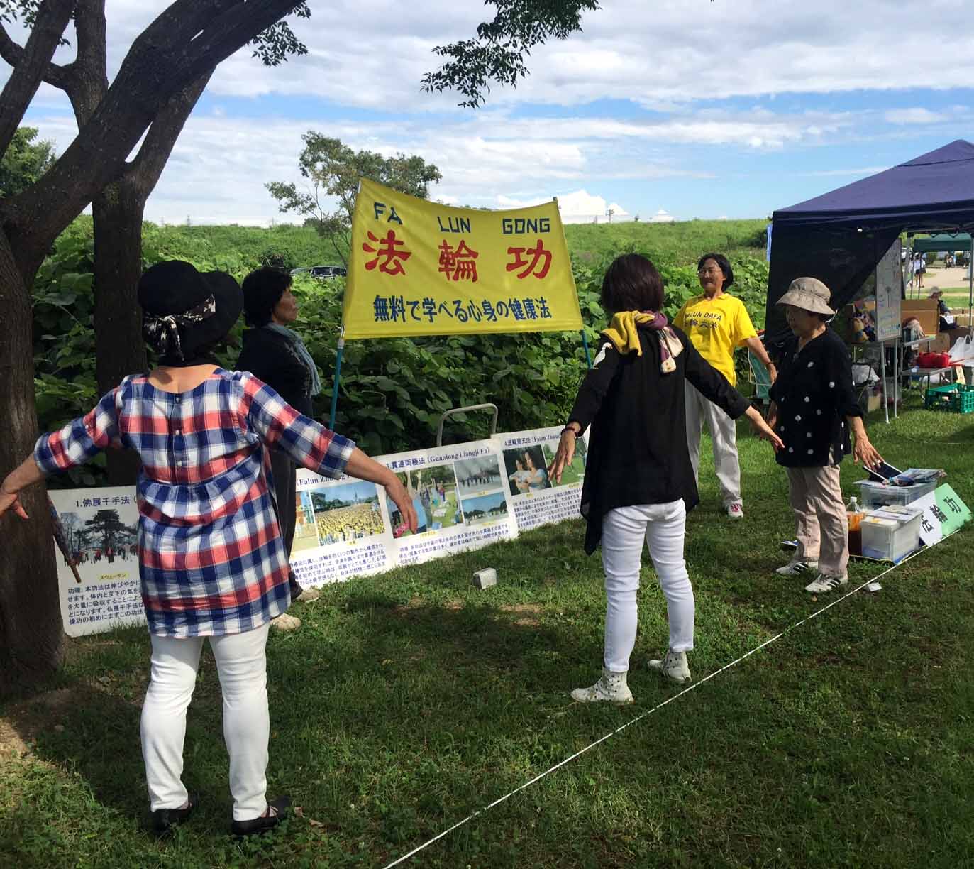 ![]() 图1-2:在稻泽夏季活动节展位上学炼法轮功的市民们 |