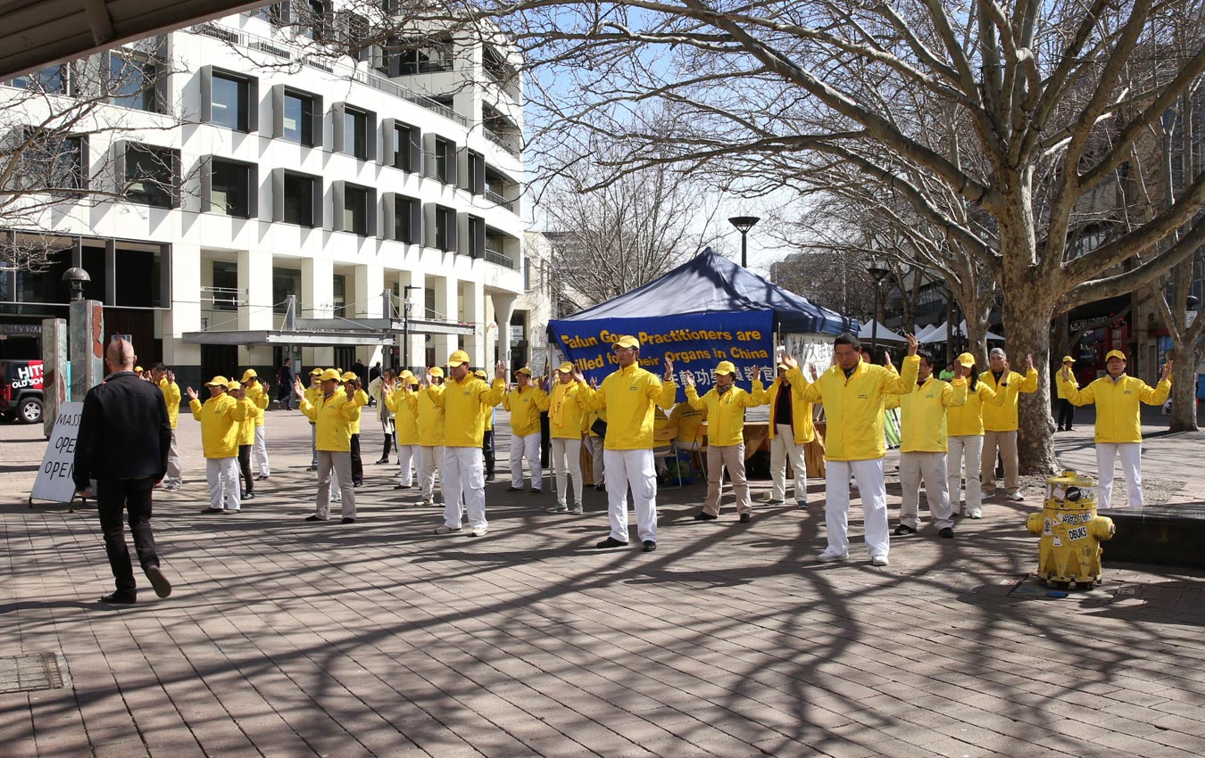 图4:集会之后,澳洲的法轮功学员继续在堪培拉的商业中心向民众传播法轮功的真相。图为法轮功学员正在演示第二套功法——法轮桩法