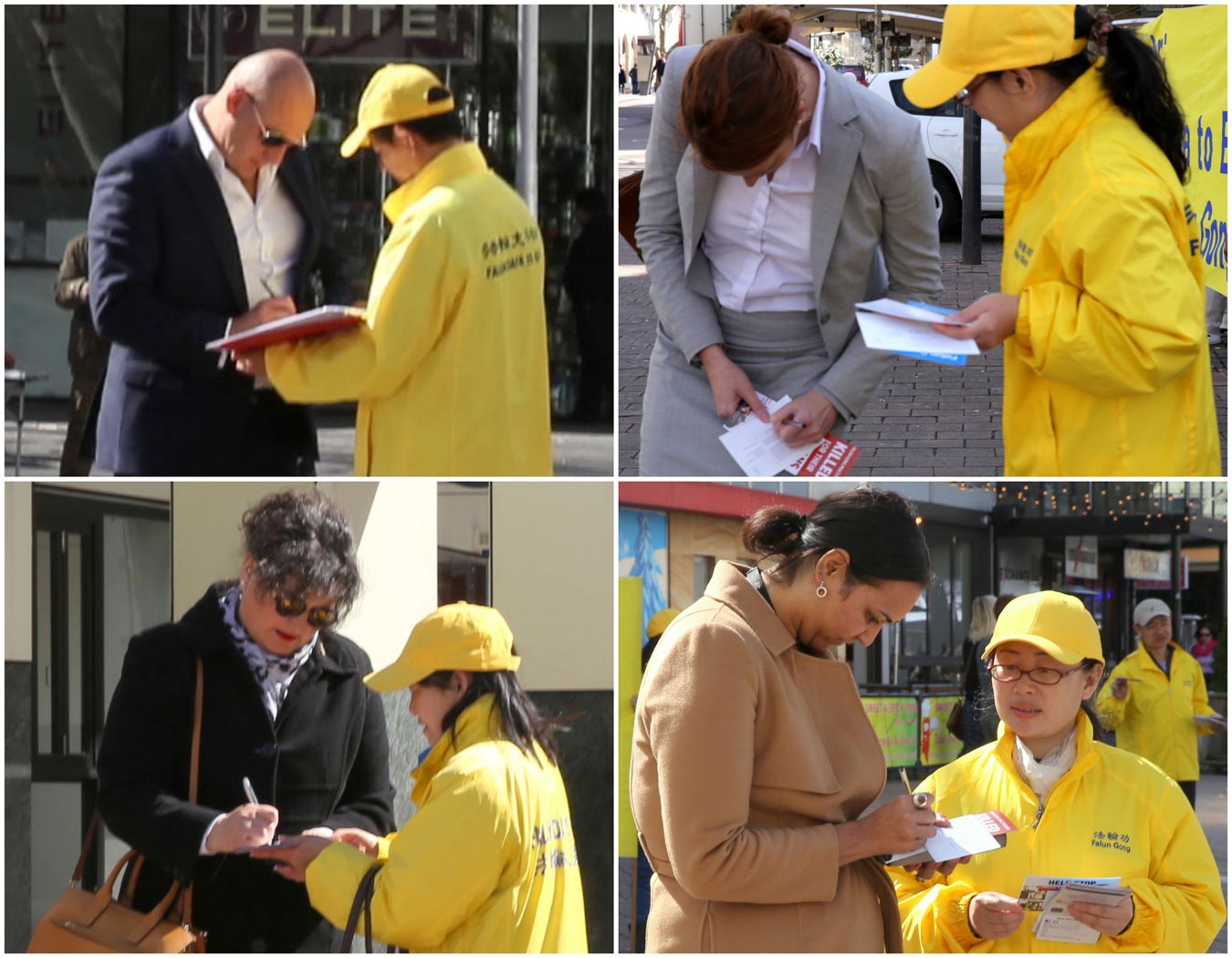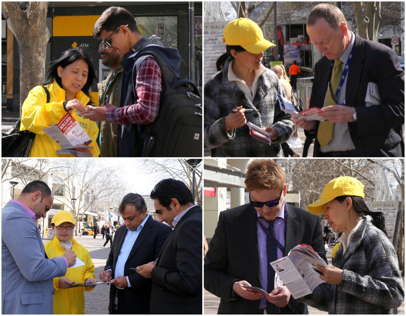 '图5-7:集会之后,澳洲的法轮功学员继续在堪培拉的商业中心向民众传播法轮功的真相,及征集签名。许多民众前面支持法轮功学员和平反迫害。'