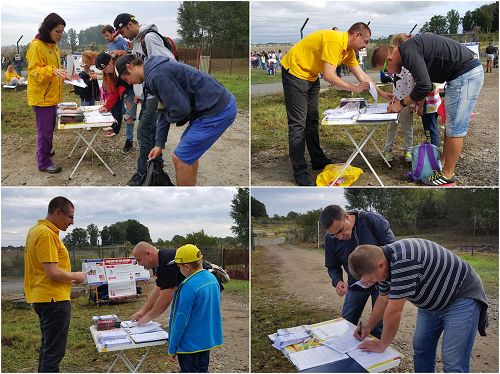 时值中秋又是周末,捷克及波兰法轮功学员共同来到航空展的Mosnov Ostrava机场举办讲真相及征签活动,很多民众因此了解了法轮功及法轮功在中国受到的迫害,纷纷签名支持法轮功学员正义行为,他(她)们同时在反对中共迫害法轮功、反对活摘器官罪行,及起诉反人类罪元凶江泽民的三种表格中签下自己的心声。