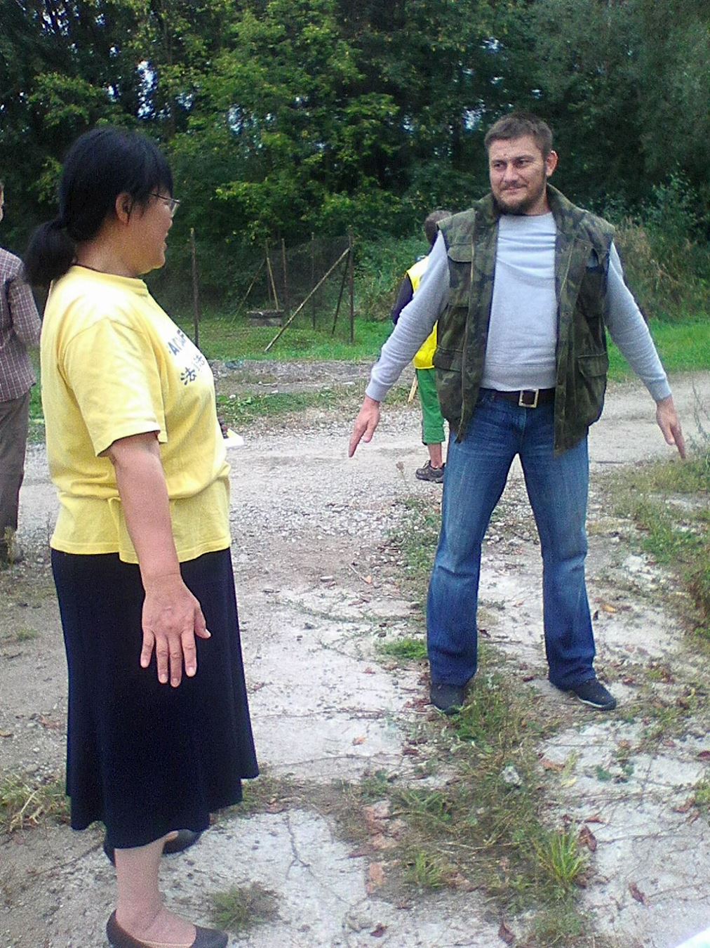两位波兰人在机场入口处看到捷克法轮功学员正在做法轮功功法展示,非常感兴趣询问是否可以学一学,波兰法轮功学员随即开始现场教功,他们很快就学会了第一套功法,并详细的记下波兰语法轮功网站和相关电话,同时也在征签表上签下自己的名字。