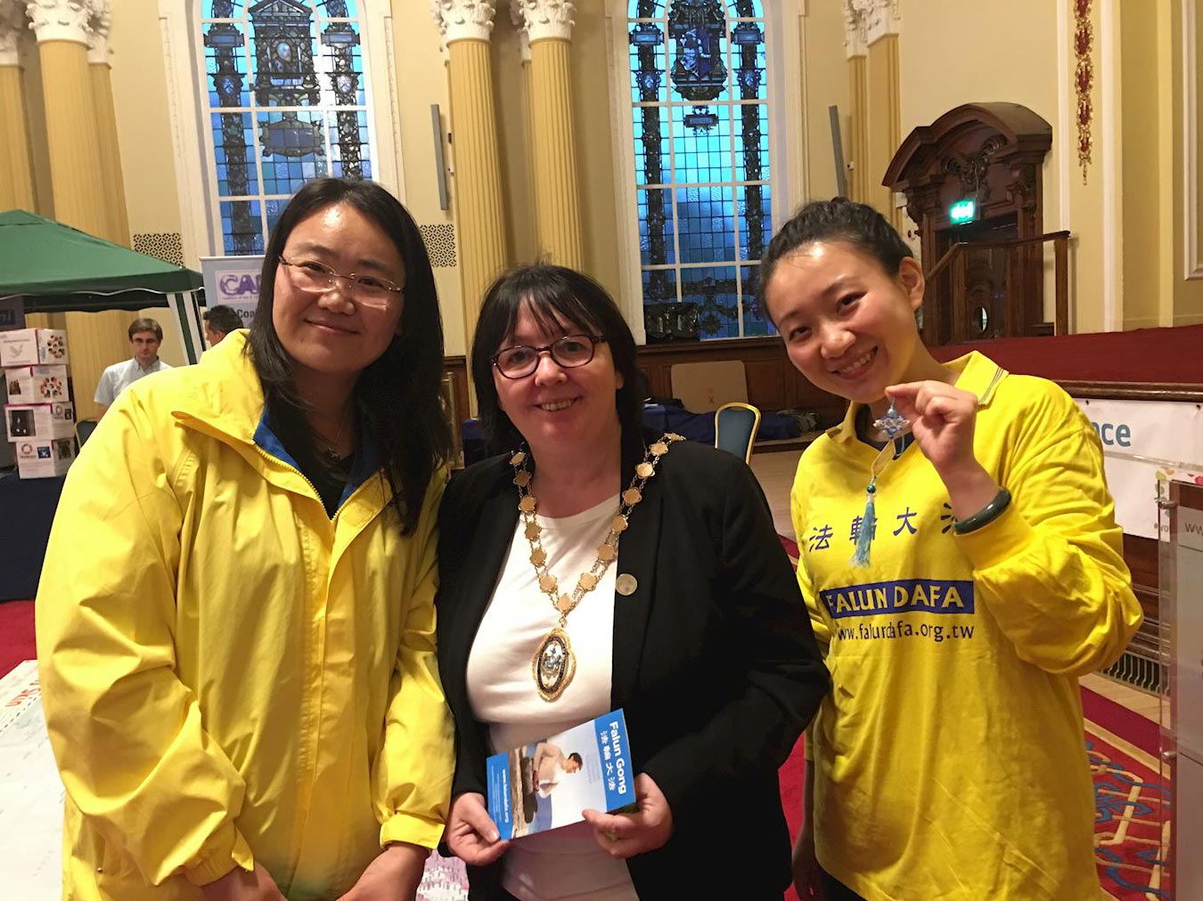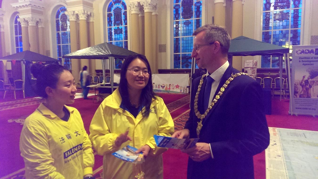 【明慧网二零一六年九月二十三日】二零一六年九月二十一日,北爱尔兰法轮功学员受邀参加了在北爱尔兰首府贝尔法斯特市政厅举办的青年和平日(YOUTH4PEACE)活动,贝尔法斯特市长布莱恩·金斯顿(Brian Kingston)、副市长玛丽·埃伦坎贝尔(Mary Ellen Campbell)也出席了此次活动。法轮功学员在活动期间进行功法演示,很多人被平和的炼功动作所吸引,了解真相并签名反迫害