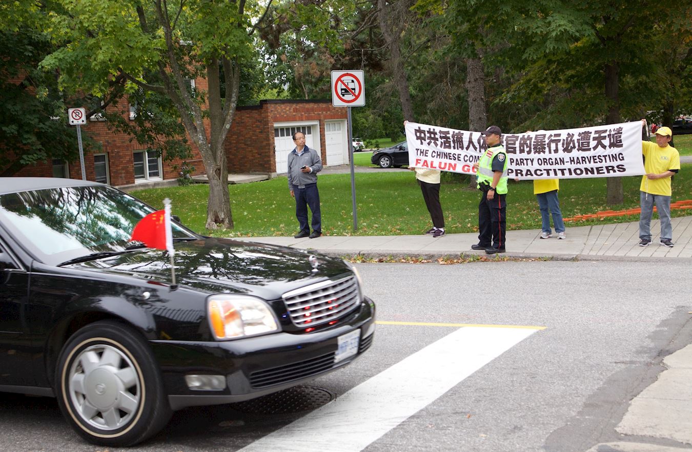 ![]() 图7:周三李克强专车抵达渥太华Westin酒店时,在酒店正门前经过法轮功横幅,法轮功学员反复向李克强一行喊话“法轮大法好”、“停止迫害法轮功”、“法办江泽民”。 |