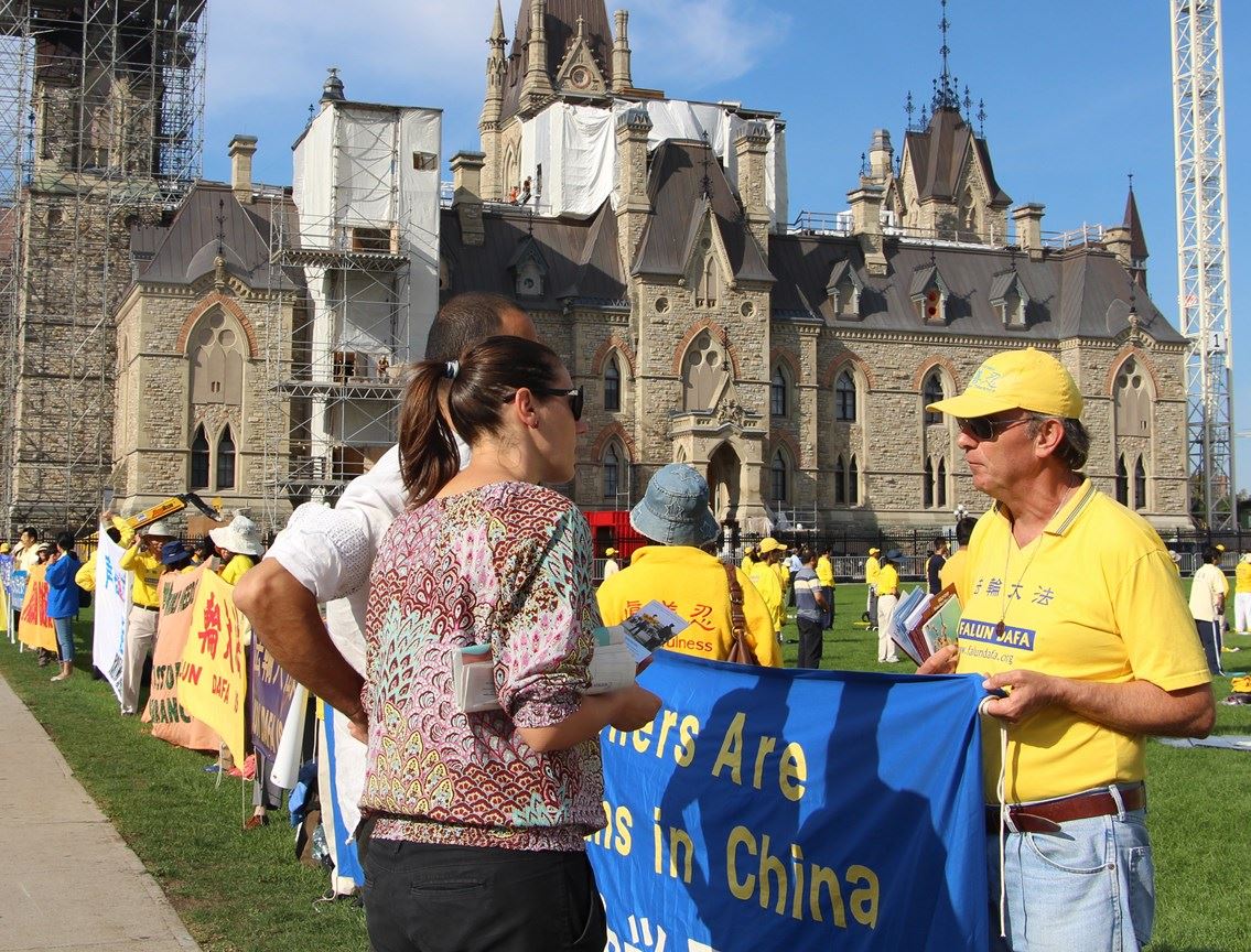 九月二十二日,李克强在加拿大国会山和加拿大总理会谈当天,加拿大东部部分法轮功学员,在国会山前的草坪上炼功,呼吁加中现任领导人,关注中共对法轮功学员的迫害,要求“停止迫害”、“停止活摘”、“逮捕迫害元凶江泽民”。