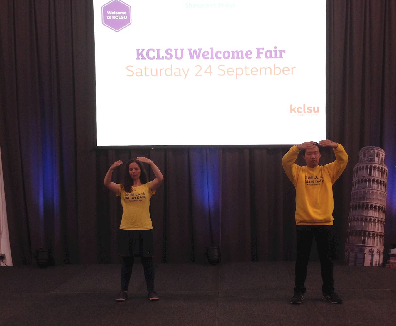 图1:二零一六年九月二十四日,法轮功学员在伦敦大学国王学院迎新会的大厅中心舞台上展示法轮功功法 |