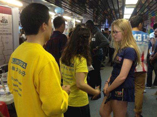 二零一六年九月二十四日下午,两位法轮功学员在展厅中心舞台上的法轮功功法一结束,就有一位有亚裔血统的女生带着激动口吻对法轮功学员说:“这(法轮功)太好了,我一定要参加。”这位女生叫艾姆瑞达(Emrida),是一位学政治经济学的大二学生,以前从未听说过法轮功,她表示刚才的功法展示让她感到放松和平静,这正是她需要的。于是,她立即向法轮功学员报名参加法轮功社团。