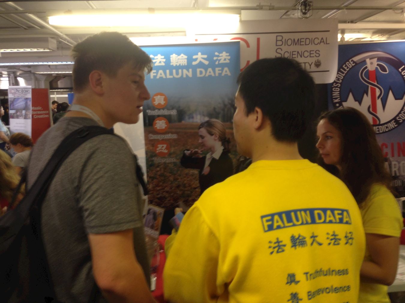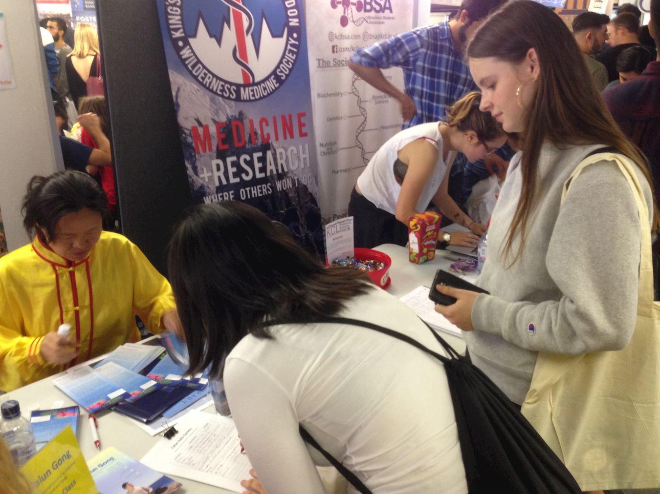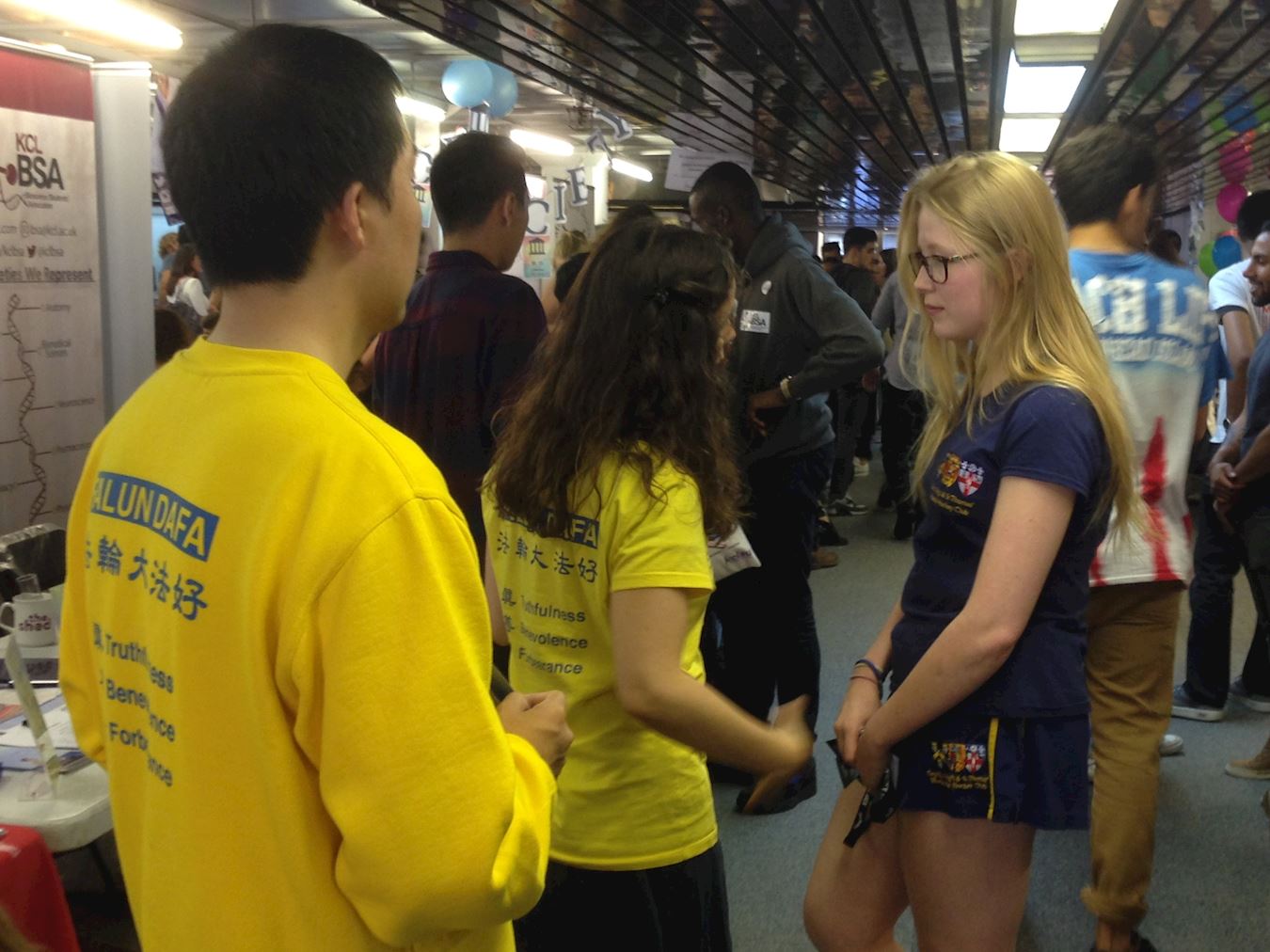 九月二十四日下午迎新会上,康妮(Connie)和佳思梅因(Jasmine)两位女生经过“国王大学法轮大法协会(Falun Dafa Society at King’s College)”展位时,面带笑容地从英国法轮功女学员蒂丽(Tilly)手中接过真相传单并驻足听她讲真相。蒂丽结合自己在法轮大法中受益的亲身修炼体会告诉她们:法轮功是一门古老的修炼方法,有帮人祛病健身、教人修心向善的强大力量,可是这么好的功法却在中国自一九九九年以来被中共残酷打压和迫害。