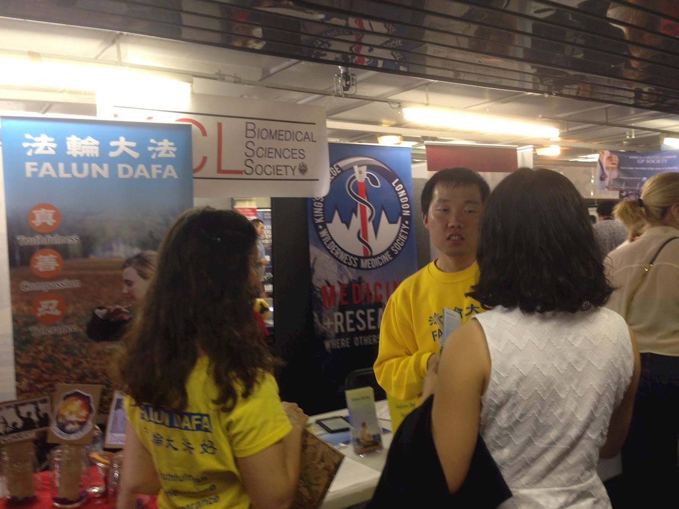 二十四日下午,法轮功学员在展厅舞台上的功法展示结束后不久,一位刚从大陆出来到国王学院学艺术的女研究生走到展桌前与法轮功学员交谈,她表示最想明白“天安门自焚”到底是怎么回事。