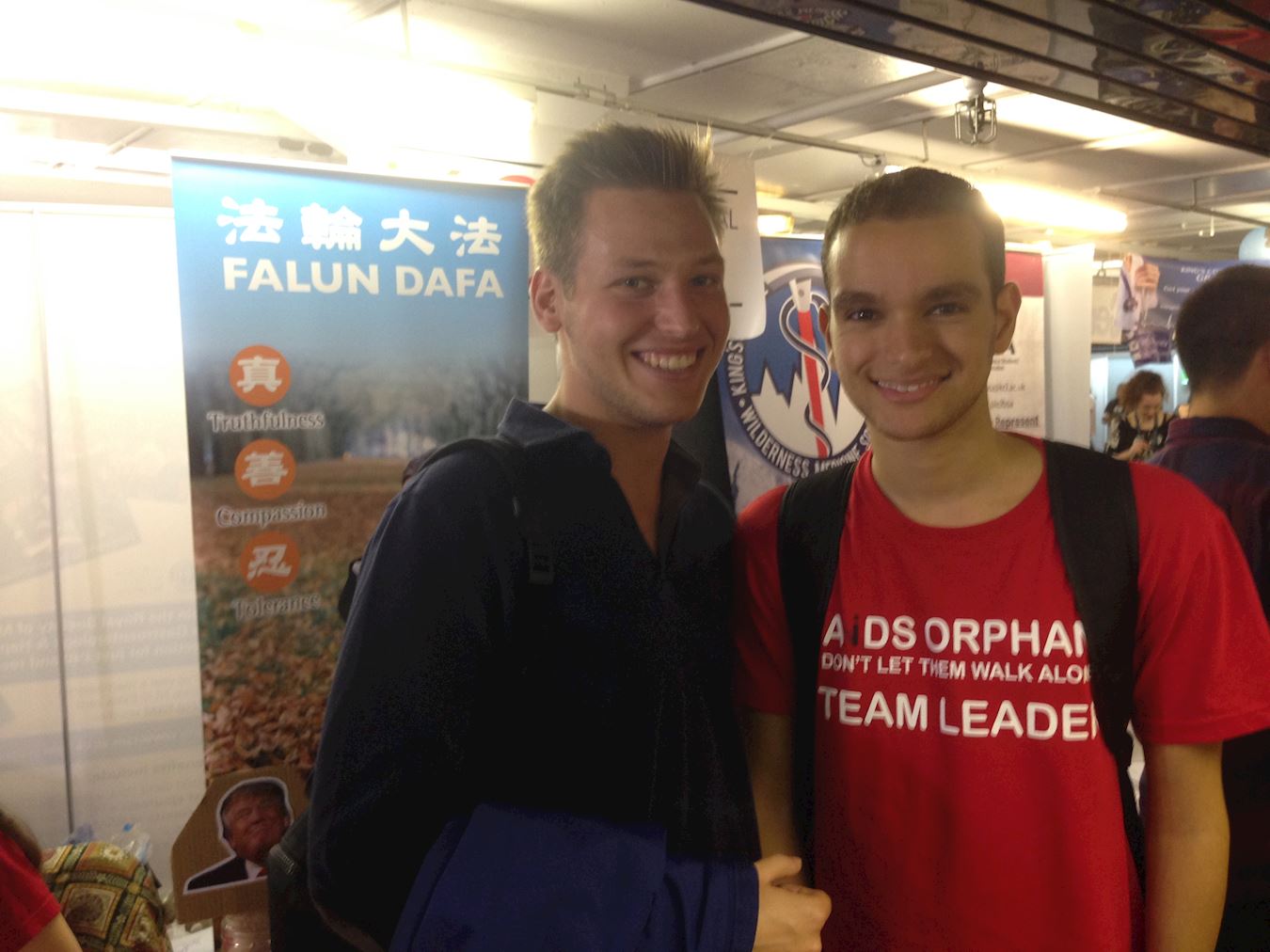 九月二十四日下午,在伦敦大学国王学院学商业管理的大二学生阿力山大(Alegsandro)径直走到“国王大学法轮大法协会(Falun Dafa Society at King’s College)”的展桌前,在报名表上签名,大约二十分钟后,他又带着自己的同学朋友山姆(Sam)也来报了名。问及二人申请积极参加法轮功社团的原因,阿力山大和山姆不约而同地回答说:
