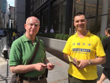 在四十八街开珠宝店的布莱恩(Brian)告诉西人学员Dorian:“这种事情太可怕了!看到这么多人关注这件事情,我很欣慰。我对你们百分之百的支持,我会把活摘罪行告诉给更多的人。我很高兴在美国也能看到‘真、善、忍’的修炼功法,我为你们感到骄傲!”
