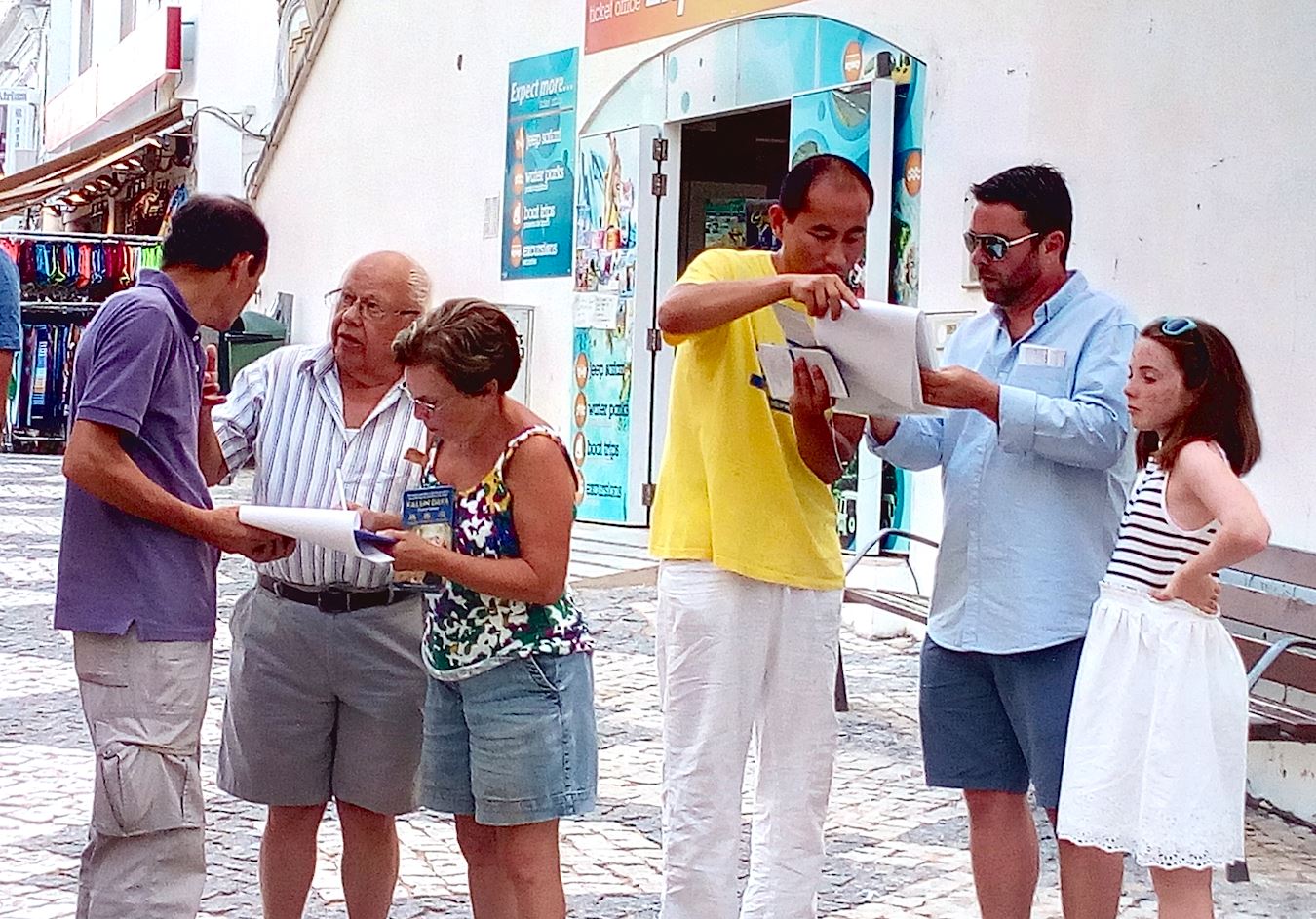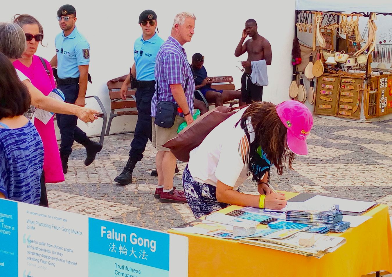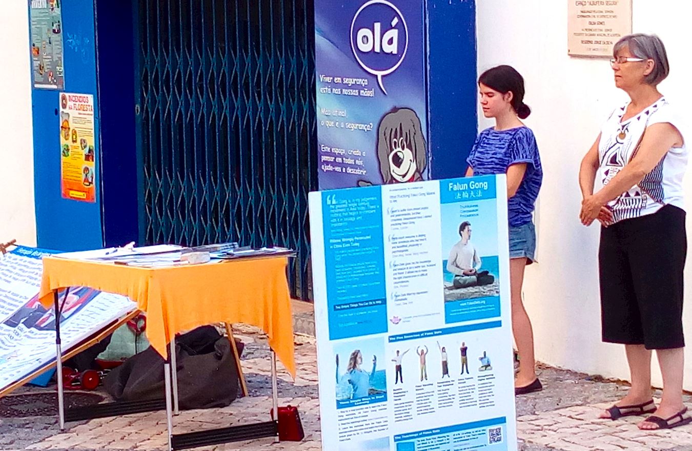 图1:二零一六年九月十七日,葡萄牙法轮功学员来到南部著名的旅游大城市Albufeira,在市中心设立真相点,向民众传播法轮功的真相。