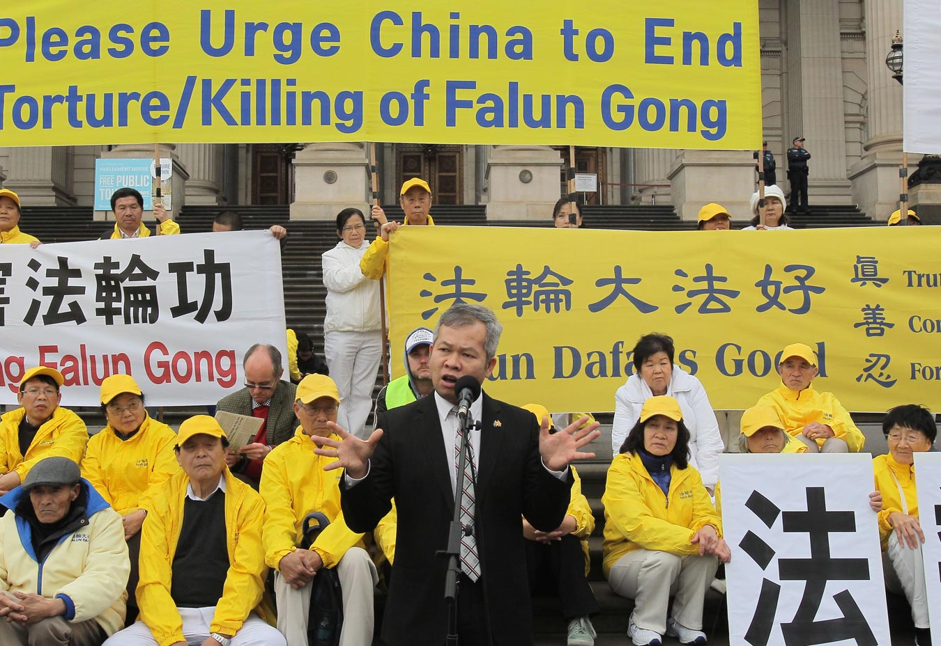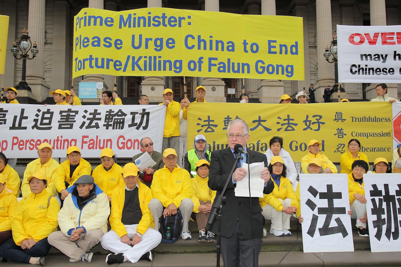 ![]() 图2:维州上议院资深议员伯尼·菲恩(Bernie Finn)在集会上发言。他希望每一位赴中国参加二十国峰会的首脑都能发出这样的声音:中共如果不能尊重中国人民的人权,就应该退出国际舞台。 |