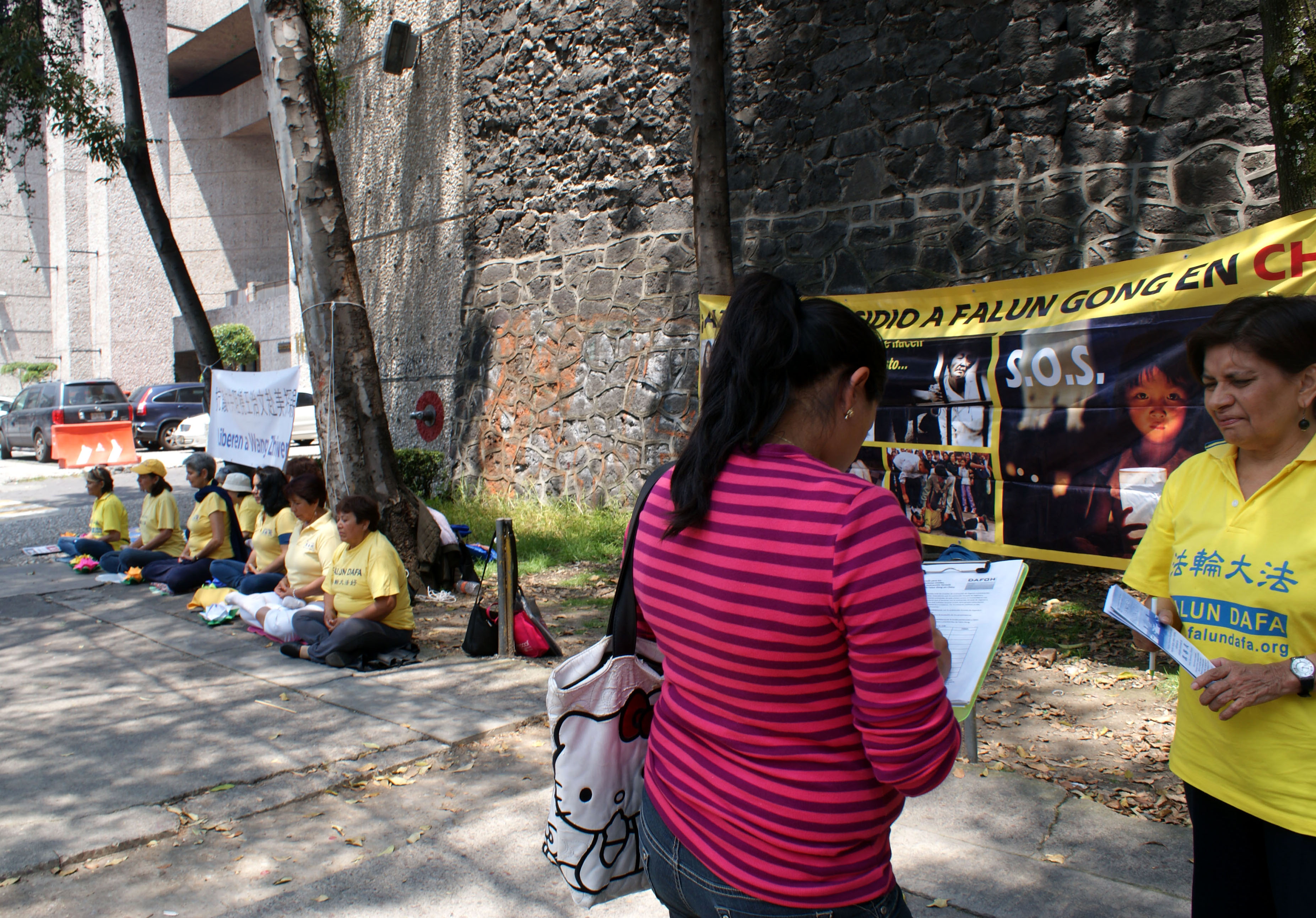在当天的和平抗议活动中,墨西哥法轮功学员有的演示法轮功的功法,有的向过往民众讲述法轮功的真相,揭露中共迫害法轮功、活摘法轮功学员器官的罪行,并征集制止中共活摘的签名。不少民众听述真相后,马上签名支持制止活摘。