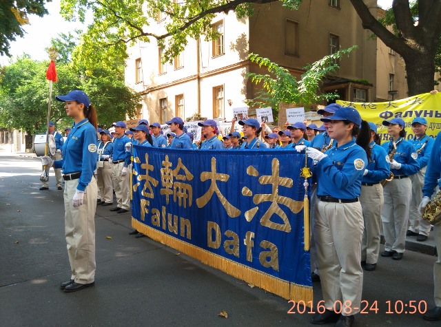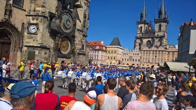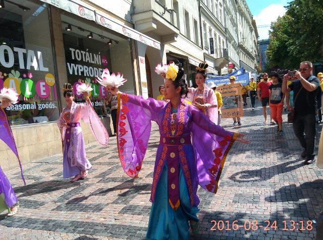 在中使馆集会后,天国乐团打头阵开始了长达三小时的游行,从市中心瓦次拉夫广场出发,沿布拉格闹市区步行街前进,经过老城广场,查理桥,小城广场直到捷克总统府广场。天国乐团鼓号震天响,仙女舞姿优美,法轮功学员功法演示祥和宁静,沿途游客及从商店和餐馆跑出来的人鼓掌欢迎,感谢游行队伍的表演。被采访的观众们都说,真壮观,太好看了,我们以前都没见过。我们非常喜欢看。观众也主动热情接受学员派发的真相资料和传单,有些观众还想了解法轮功,请学员讲解。