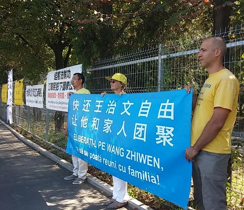 '图:法轮功学员在中国驻罗马尼亚使馆前声援王治文'