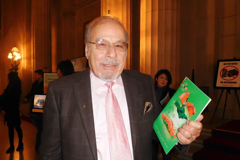 神韵艺术团今年在旧金山歌剧院八天九场的演出,吸引众多当地各界精英名流慕名前来观赏。知名小提琴家Gerard Jirayr Svazlian出生在亚美尼亚,他自一九八一年起就是旧金山交响乐团的终身成员,目前在旧金山音乐学院教授小提琴。二零一七年一月五日晚,Svazlian先生欣赏了神韵纽约艺术团在旧金山歌剧院的第五场演出。Svazlian先生表示:“我觉得他们应该获得所有的掌声,应该获得全世界所有的荣誉 。”