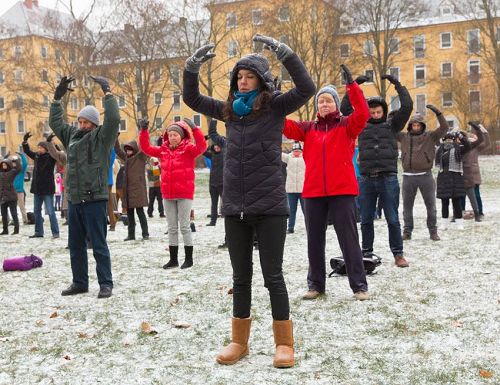 ![]() 图4~6:法会期间中西方法轮功学员们雪中集体炼功 |