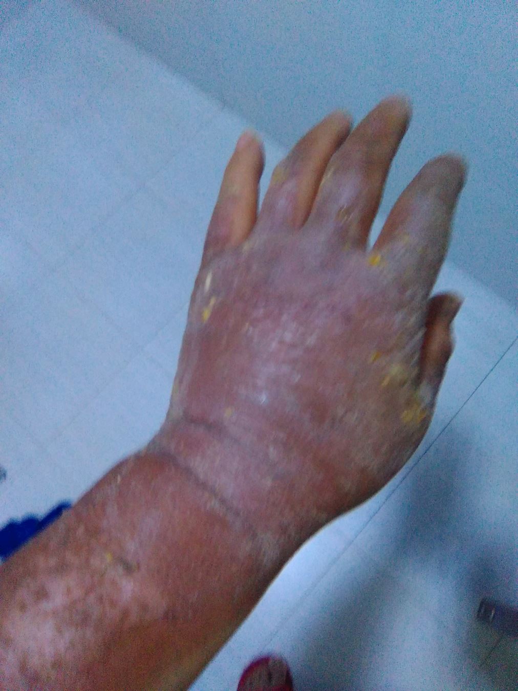 二零一六年十二月三日上午,我用大勺烧了五斤多的豆油,结果又去干别的活忘记了豆油。当我闻到了烟味时才发现豆油着火了,我因不懂灭火常识,关闭了煤气,端起大勺就匆匆往卫生间走,结果火就扑向我的脸、脖子和手,我一惊把大勺往卫生间一扔,油火顿时成了一片火海,紧接着,盖洗衣机的帘和塑料布引着了,塑料盆引着了,走廊门口的脚垫也着了,身上的裤子也呼呼的着,脚和脚脖烧伤了。
