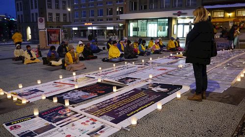 在严寒中静静打坐的学员,点点的烛光,一幅幅被中共迫害致死的法轮功学员的照片与简介,以及揭露中共活摘法轮功学员器官罪行的横幅,让很多路人驻足观看,有的向法轮功学员了解更多的讯息。