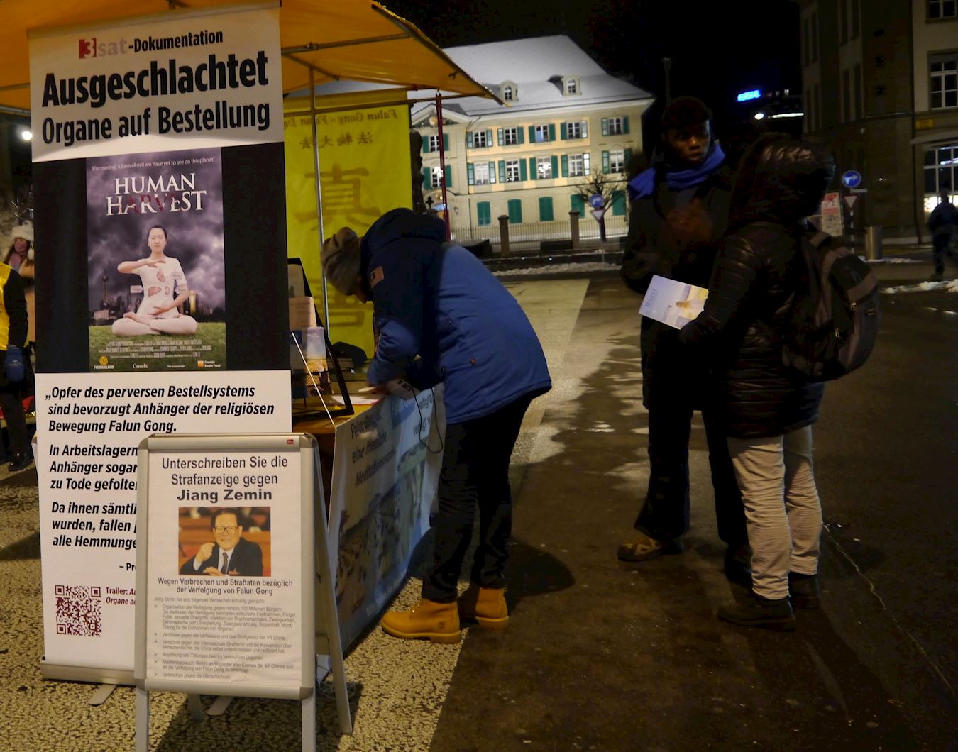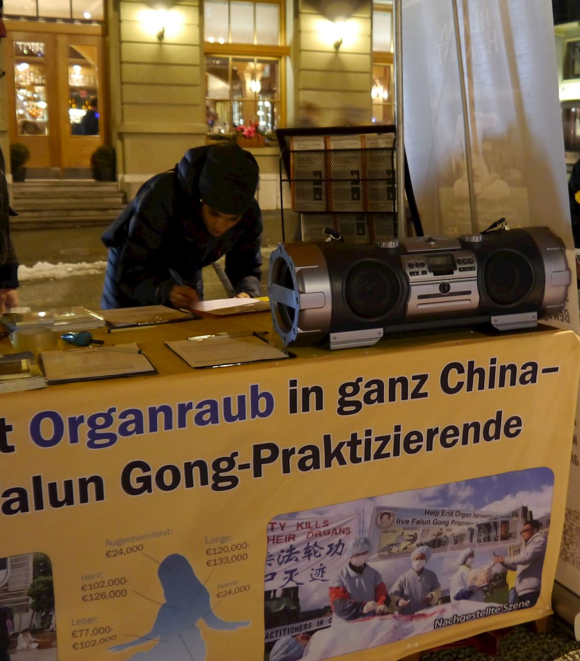 法轮功学员表示:“习*近*平来访瑞士之前,我们希望能够让更多人来关注、制止中共对法轮功的迫害以及活摘法轮功学员器官的暴行。同时也希望能够让习*近*平知道,已有二十多万法轮功修炼者和家人提交了控告元凶江泽民的刑事控告状,在瑞士,在世界各地不断有人签名支持对江泽民提出公诉。”