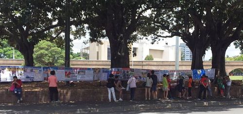 邹女士还表示,一些散客都会主动过来讲给我听一些大陆目前发生的情况,我和他们交流之后也让他们明白了为啥“三:退.保平安”的真相,他们也愿意做“三:退.”,有的游客主动来拿《·九·评*》和其它真相资料;有的对着横幅拍照、带回去给亲朋好友看。