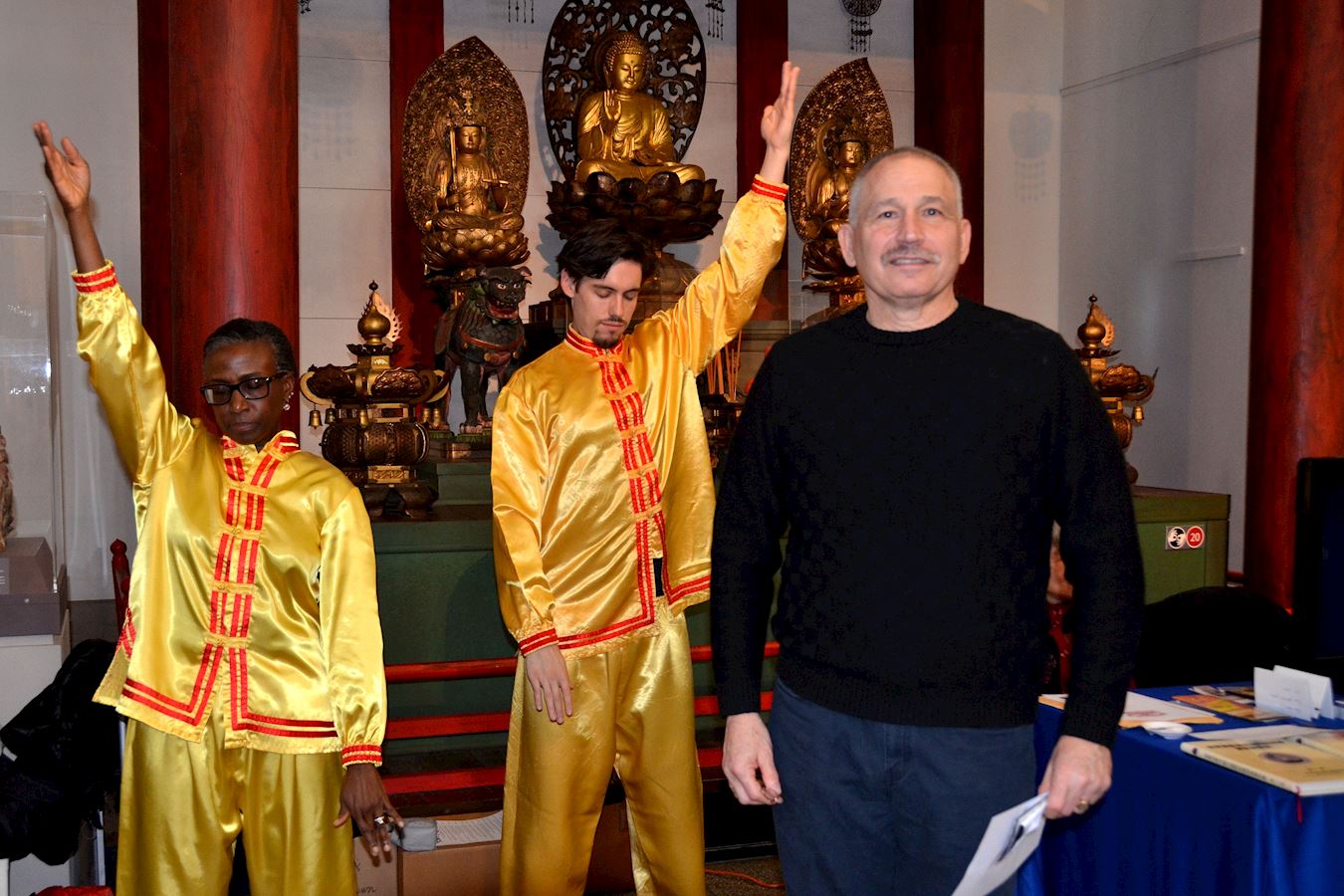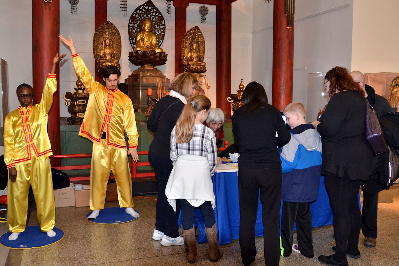 当天,这座著名的博物馆里熙熙攘攘,热闹非凡。一整天的各种活动丰富多彩,有音乐、舞蹈、书法表演、舞狮、武术、太极和法轮功功法演示、手工制作、儿童娱乐等。法轮功学员设立了展位,并由迎新年活动组织者安排做了功法演示,向民众介绍法轮功祛病健身、提升道德水平的神奇功效。学员还为西人观众展示了中国书法。法轮功展位前经常是挤满了人,功法演示也吸引了民众济济一堂学炼法轮功。