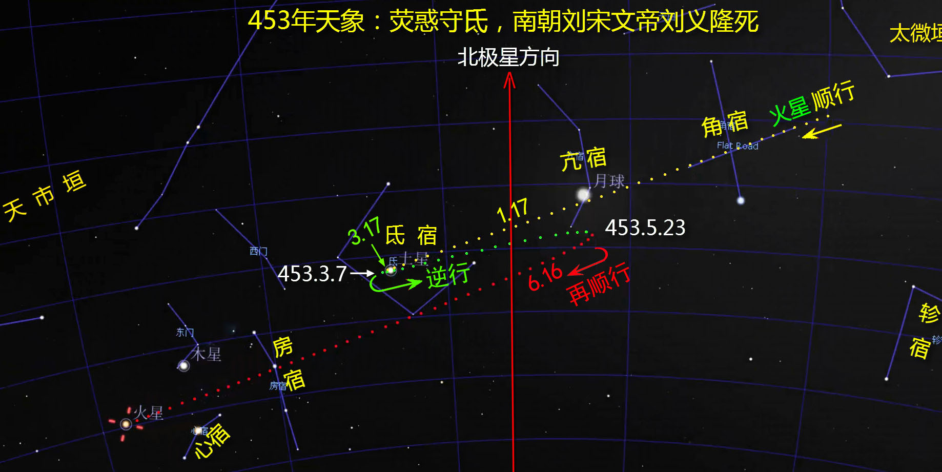 ![]() 图:453年天象图,荧惑顺行守氐宿(当年宋文帝刘义隆死于太子之手) |