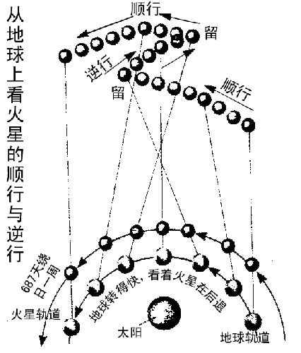 人们看到的行星,总是“顺行—逆行—再顺行”地运行着。为什么会逆行?以火星为例,在地球上看,地球远离火星时,火星在顺行;当地球靠近火星时,因为地球运行速度快,所以会看到火星在后退,就像坐在快车上,看到向前开的慢车在“后退”一样。