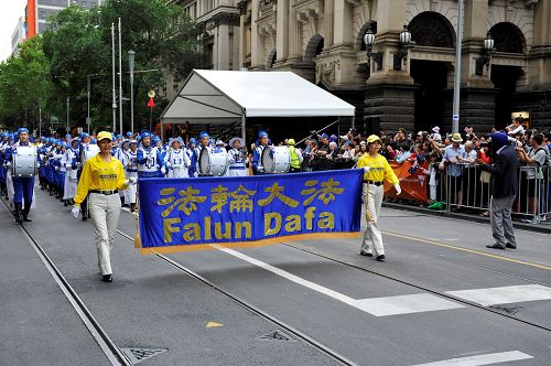 ![]() 图1-2:墨尔本一年一度的澳大利亚国庆日大游行上,法轮功学员的队伍受欢迎。 |