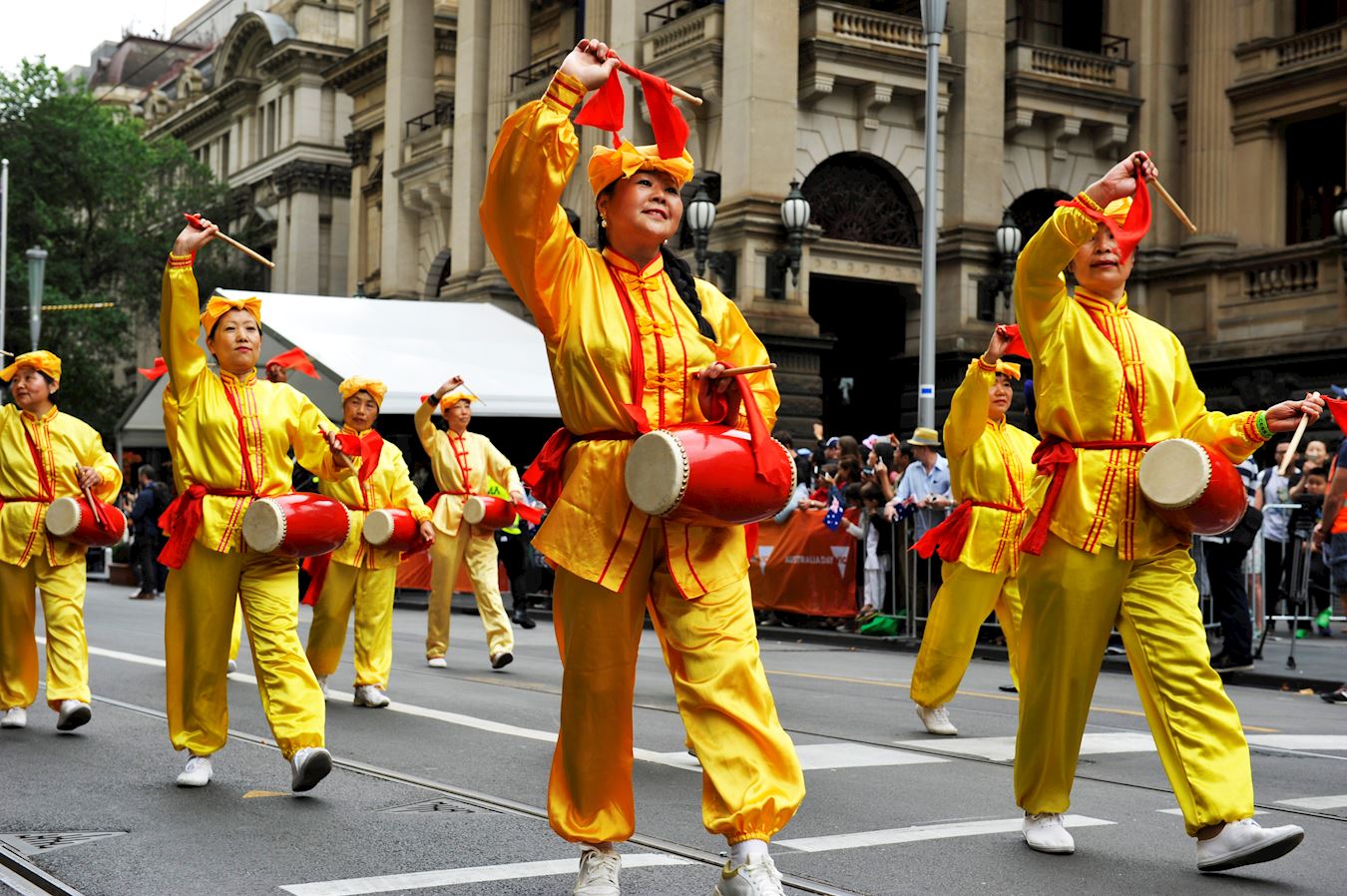 维州法轮大法学会今年再次受邀参加国庆日大游行,法轮功学员的游行队伍由天国乐团打头,紧随其后的是法轮功学员的五套功法展示,祥和慈悲的能量场令人动容。后面是扇子舞队,还有腰鼓队。鼓号乐声、雄浑威武,带给人们希望,期待新的一年收获成功。