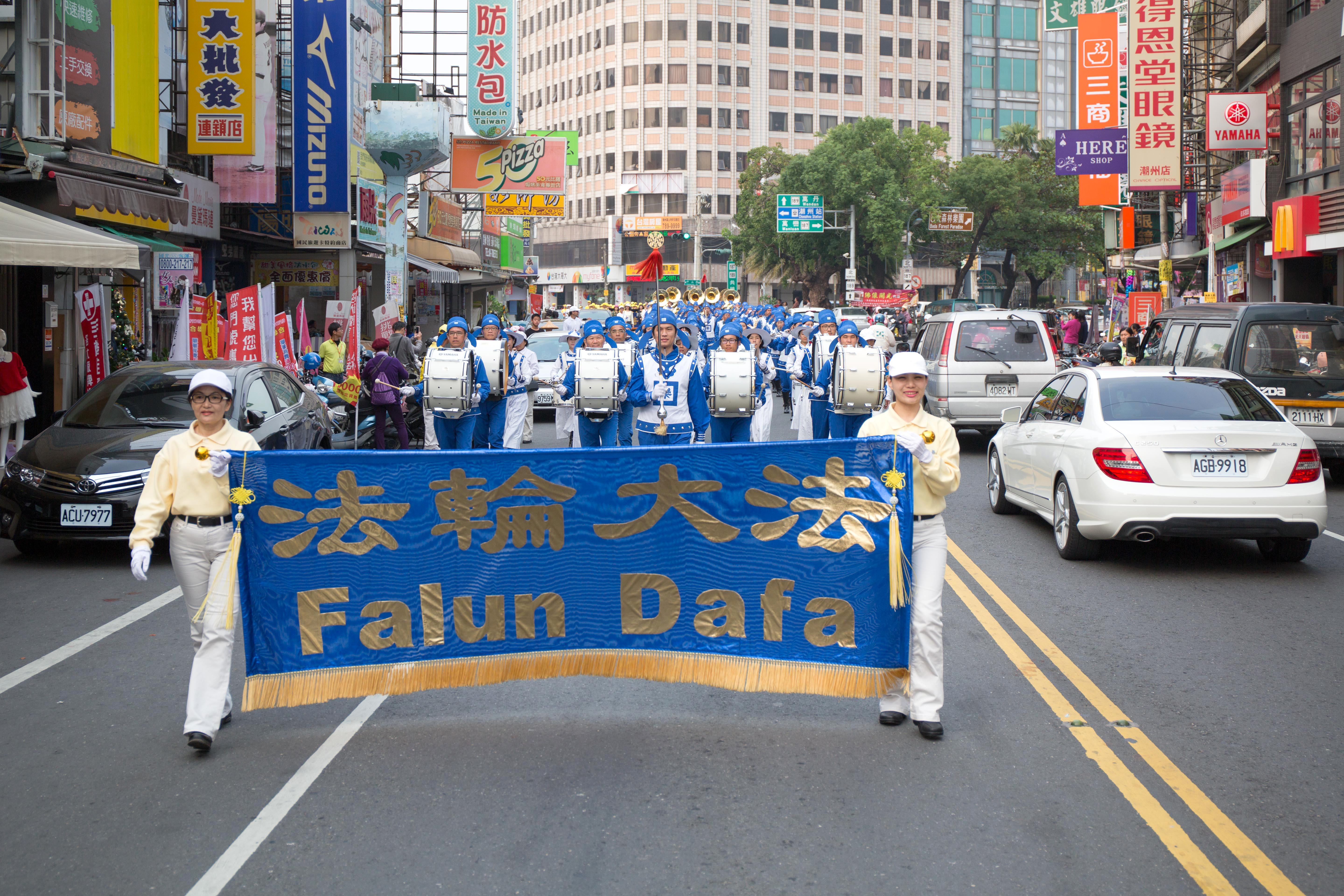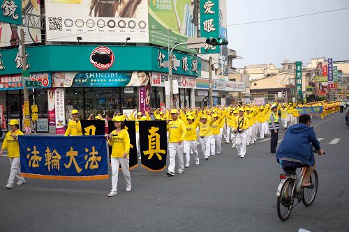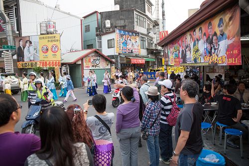 图3-5:台湾屏东潮州镇岁末祈福游行,法轮功队伍沿途吸引很多民众驻足观看 |