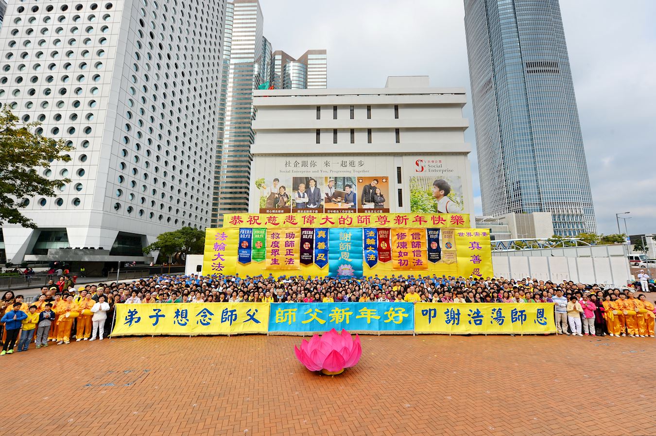 一月一日清晨,香港及来自东南亚国家的部份法轮功学员,齐聚中环爱丁堡广场举行集会,拜年活动在天国乐团演奏“法轮大法好”等乐曲声中展开,紧接着腰鼓队的喜庆表演之后,学员们双手合十向李洪志先生恭祝新年好,“师父您好!师父新年好!”“恭祝师父新年快乐!”“师父,谢谢您!”学员们怀着无比感恩的心情,高唱《法轮圣王》、《法正乾坤》、《法轮大法好》等歌曲,在欢愉和掌声中,向李洪志师父恭贺新年。