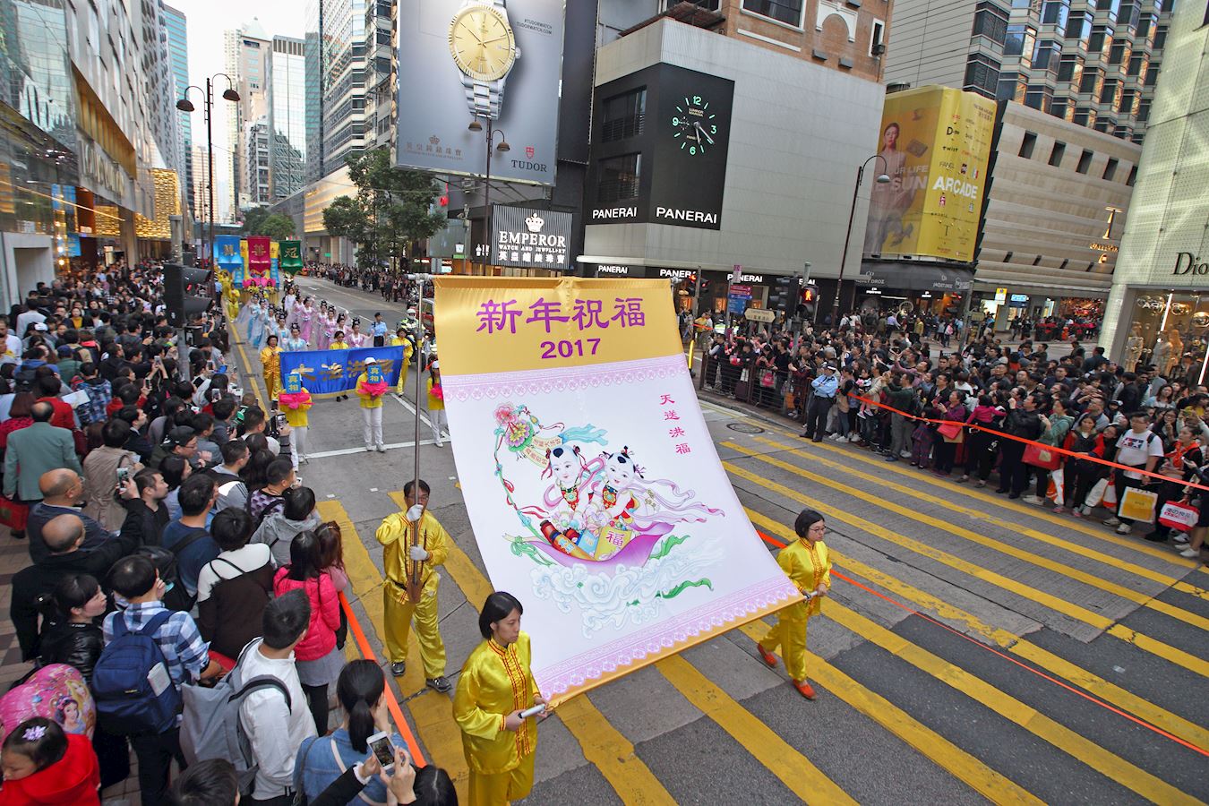 ![]() 图1:法轮功学员于二零一七年一月一日上午,在香港中环爱丁堡广场集会,恭祝李洪志大师新年好。 |