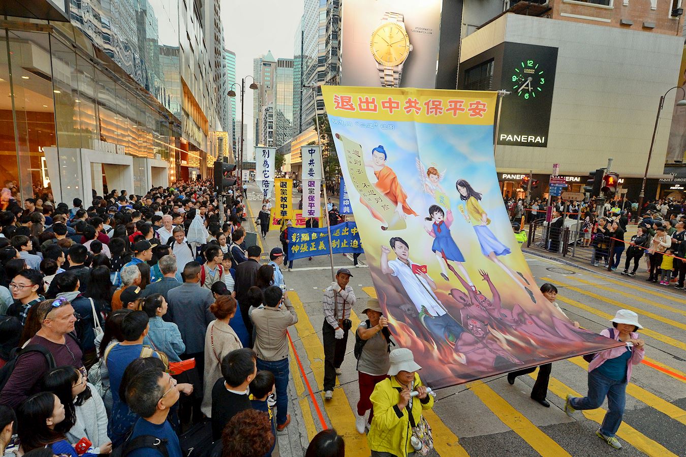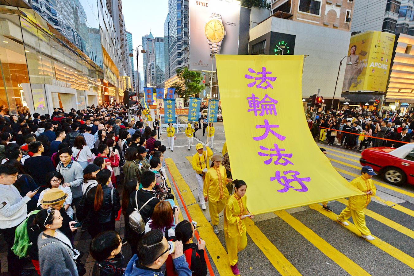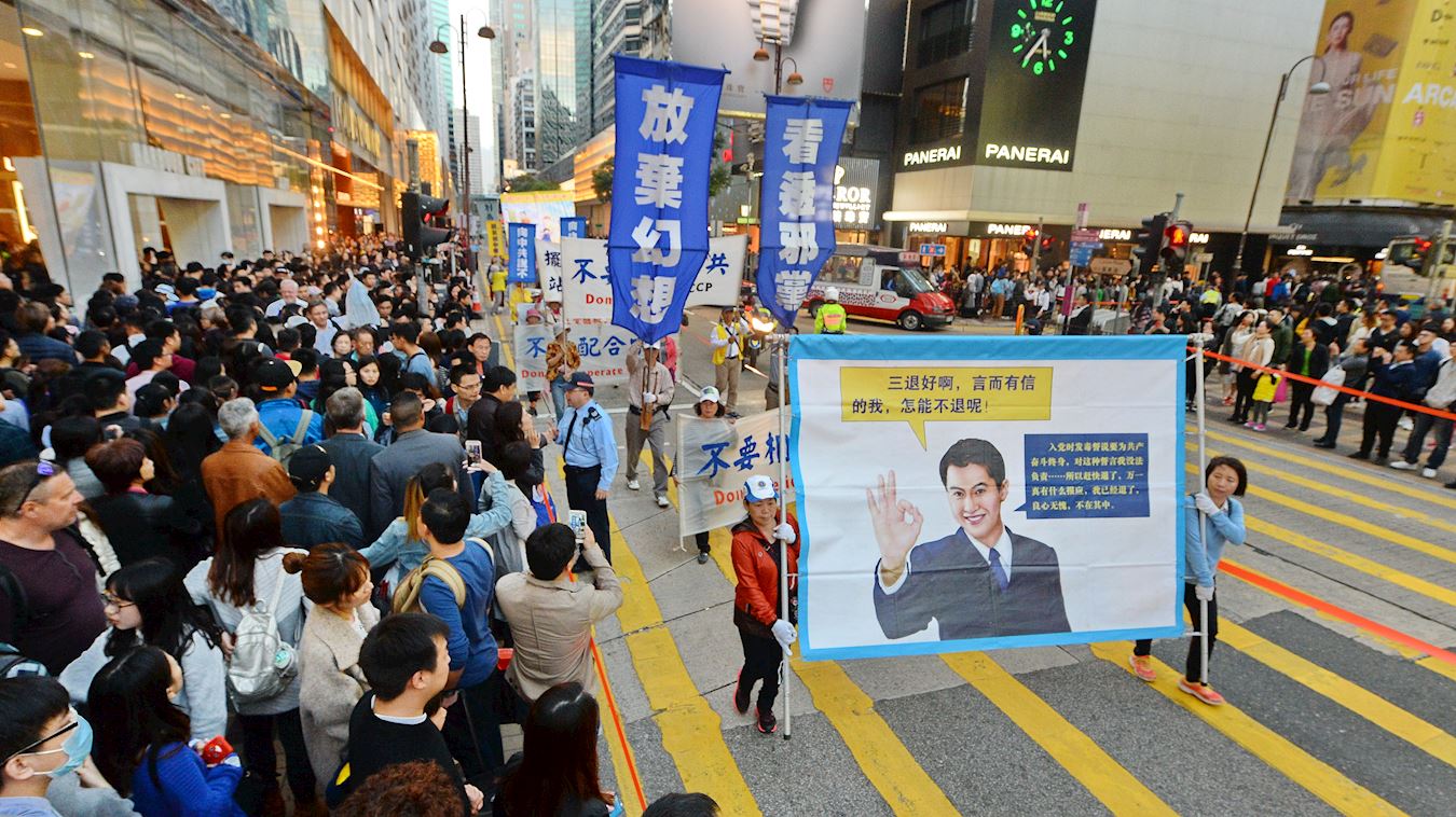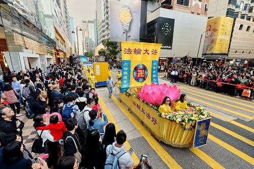 法轮功学员透过游行展示法轮大法的美好,揭露中共的迫害,希望更多人了解真相,彰显正义良知,走向光明的未来。游行队伍分为“明真相 得吉祥”、“和平理性反迫害”、“扬正气 擒恶狼”、“天灭中共 三:退.是福”、“法办元凶 结束祸港”、“法轮大法好”等六大阵列,途经九龙多个闹市,吸引许多中外民众驻足观看。不少大陆游客表示深感震撼,支持法轮功真善忍的精神。