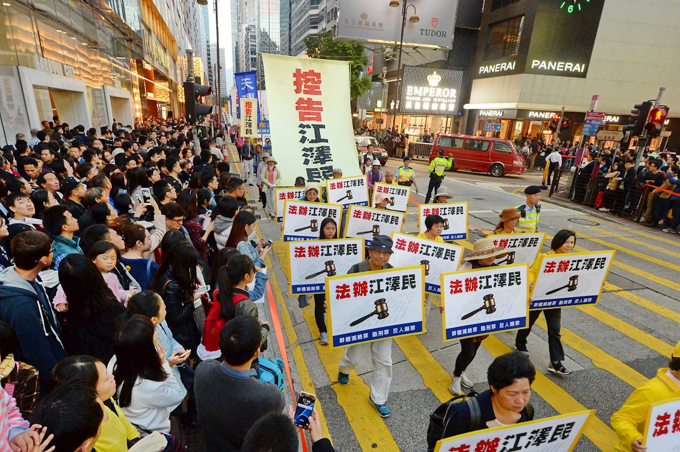 旺角亚皆老街路口,一对操上海口音,年约六、七十岁的夫妇,兴致勃勃地观看游行。太太用相机拍下游行场面。官员模样的丈夫表示,他很赞同法轮功学员的诉求,要法办迫害法轮功的元凶。他说:”法轮功是炼身体的,又不是坏事”,他赞扬游行讲出老百姓心里话:“这是民声。”他说:“游行打出来的抓江泽民,就抓江泽民。该抓的就抓,这些(迫害元凶)都是败类。老百姓都在骂江泽民,骂这些坏人,曾庆红也应该抓,他是一个大贪官。”他称赞习*近*平抓这些迫害元凶,是为老百姓出气。