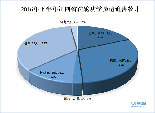 【明慧网二零一七年一月三日】(明慧网通讯员江西报道)2016年下半年,江西省法轮功学员仍然受到中共的残酷迫害,尽管与去年同期相比,迫害案例下降12.4﹪(2015年下半年共计105起迫害,2016年下半年共计92起迫害)。
