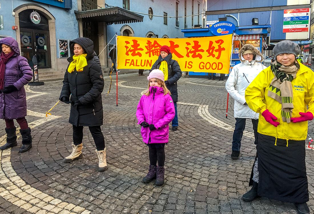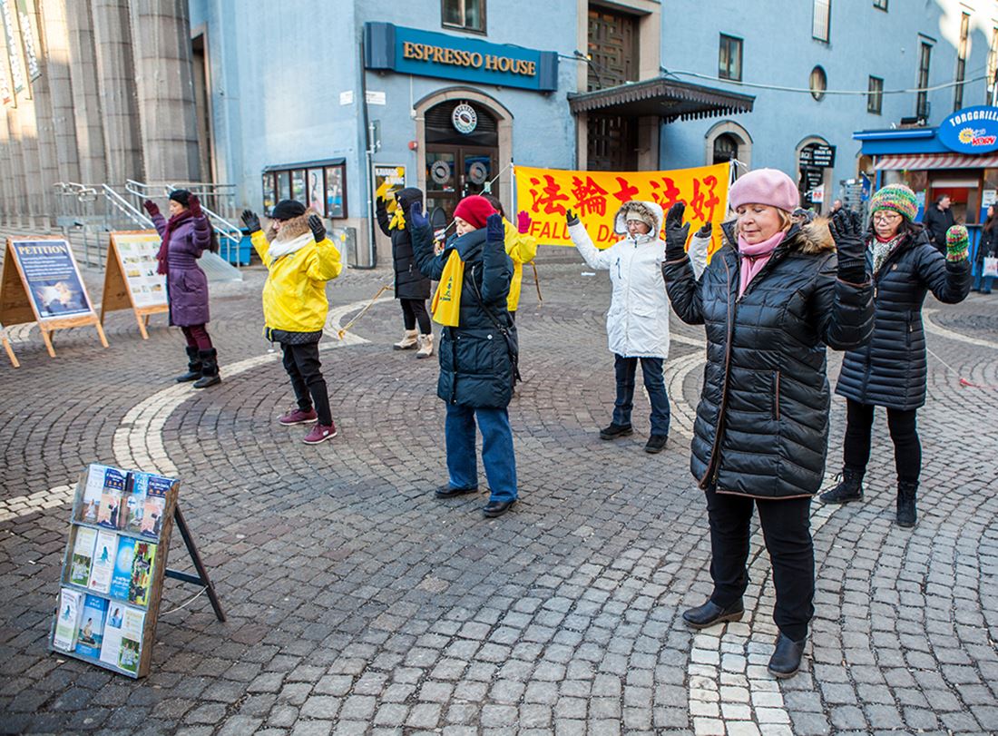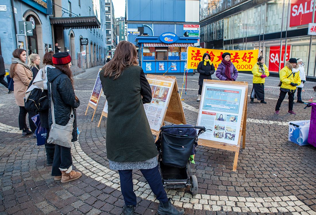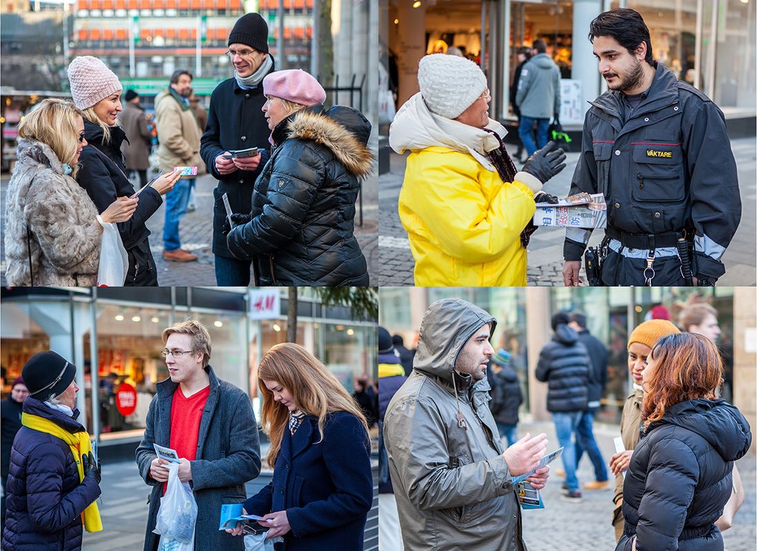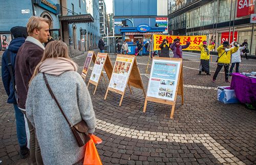 当天的活动场地位于市中心Hötorget 地铁站附近,不远处是购物商城、超市和农贸市场。尽管天气寒冷,但来来往往的人特别多。学员们摆放好真相展板、竖起”法轮大法好”醒目的横幅,有的伴随着优美的炼功音乐向人们展示法轮功功法,有的向过往民众发放真相资料、面对面的向人们讲述着中共迫害法轮功及活体摘取法轮功学员器官的残暴行径。