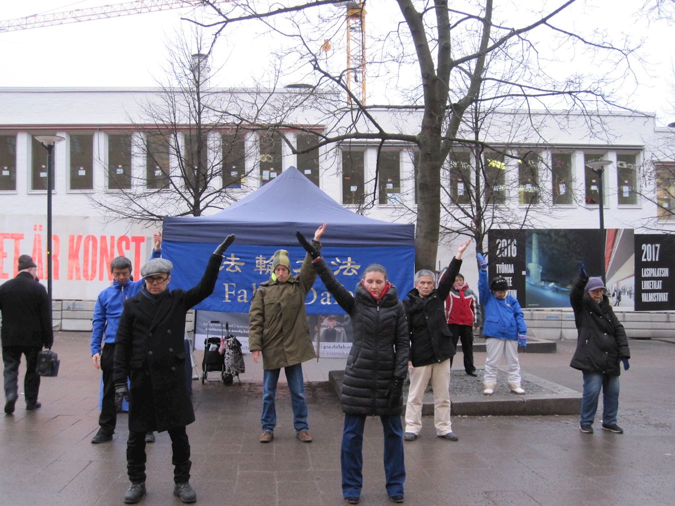 '图1:法轮功学员在芬兰首都市中心举办弘法活动,图为学员们在集体炼功'