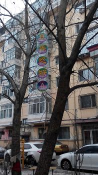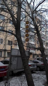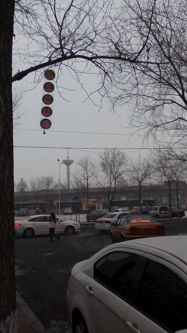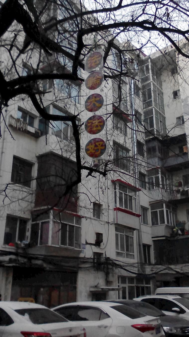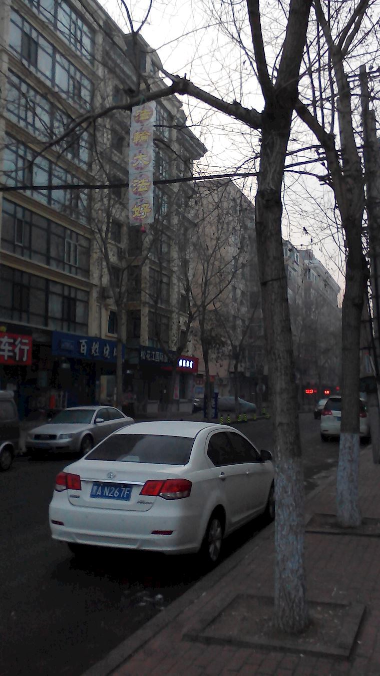 今天哈尔滨市街头烟雾弥漫,(图1)。12月30日出现在街道上的条幅给昏沉的天空加了一丝色彩。
