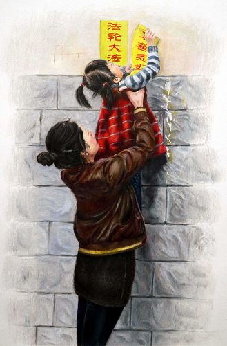这幅画描述的是一个母亲和一个孩子,配合着张贴“法轮大法好”的真相标语。母女间的配合协调一致。在中国大陆,法轮功学员们将“法轮大法好,真善忍好”的福音通过各种途径传递给可贵的中国人。